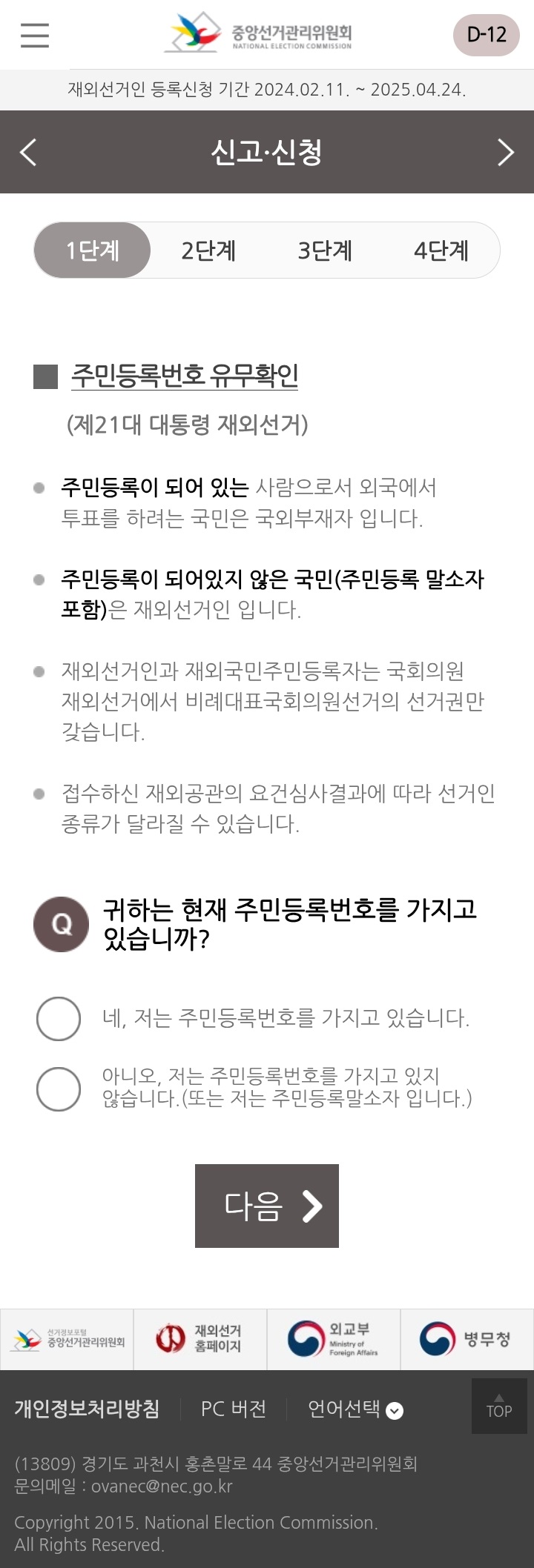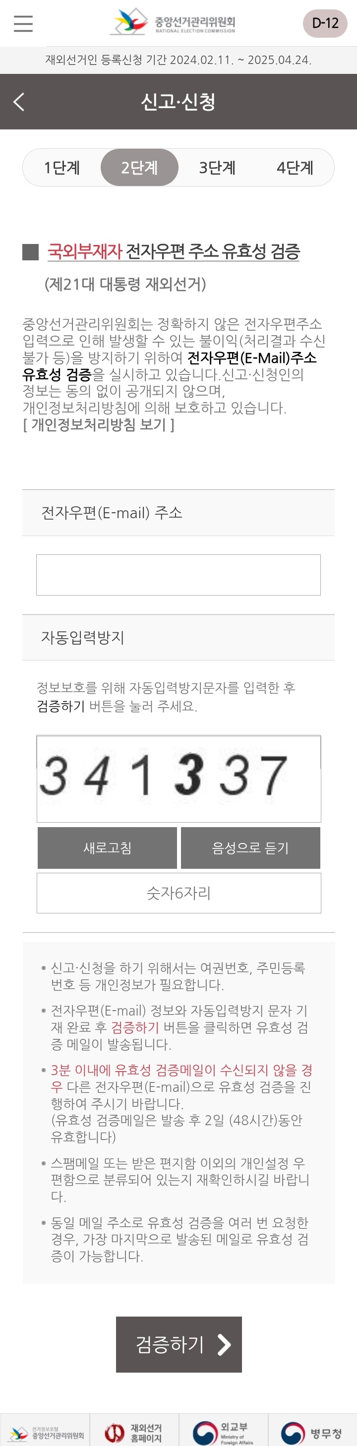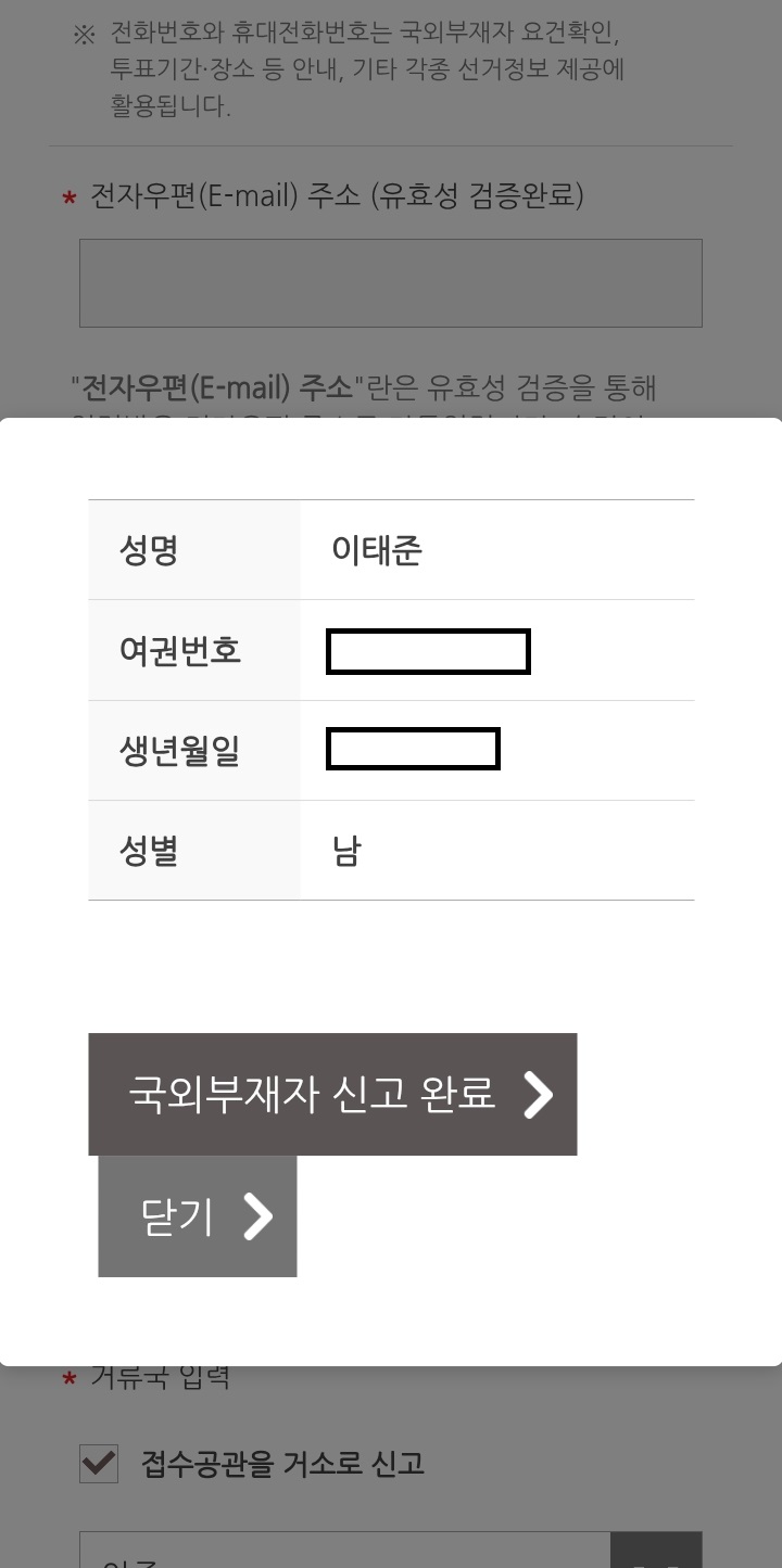 국외부재자든 재외선거인이든 전자우편 주소 유효성 검증 절차가 필요합니다. 본인의 이메일 주소를 입력한 후 절차에 따라 유효성 검증을 하시면 되겠습니다.