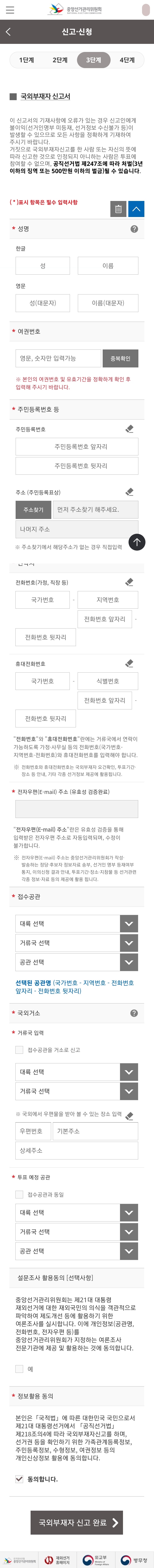 이미지가 상당히 길죠? 본게임입니다. 본인의 성명, 여권번호, 주민등록번호, 주소, 연락처, 접수공관 및 국외거소, 투표 예정 공관 등을 입력하시면 됩니다. 국외거소는 접수공관을 거소로 신고하는 경우가 대부분이죠. 설문조사 활용동의는 선택사항이구요. 이메일은 유효성 검증을 마친 주소가 자동으로 입력되어 있습니다.