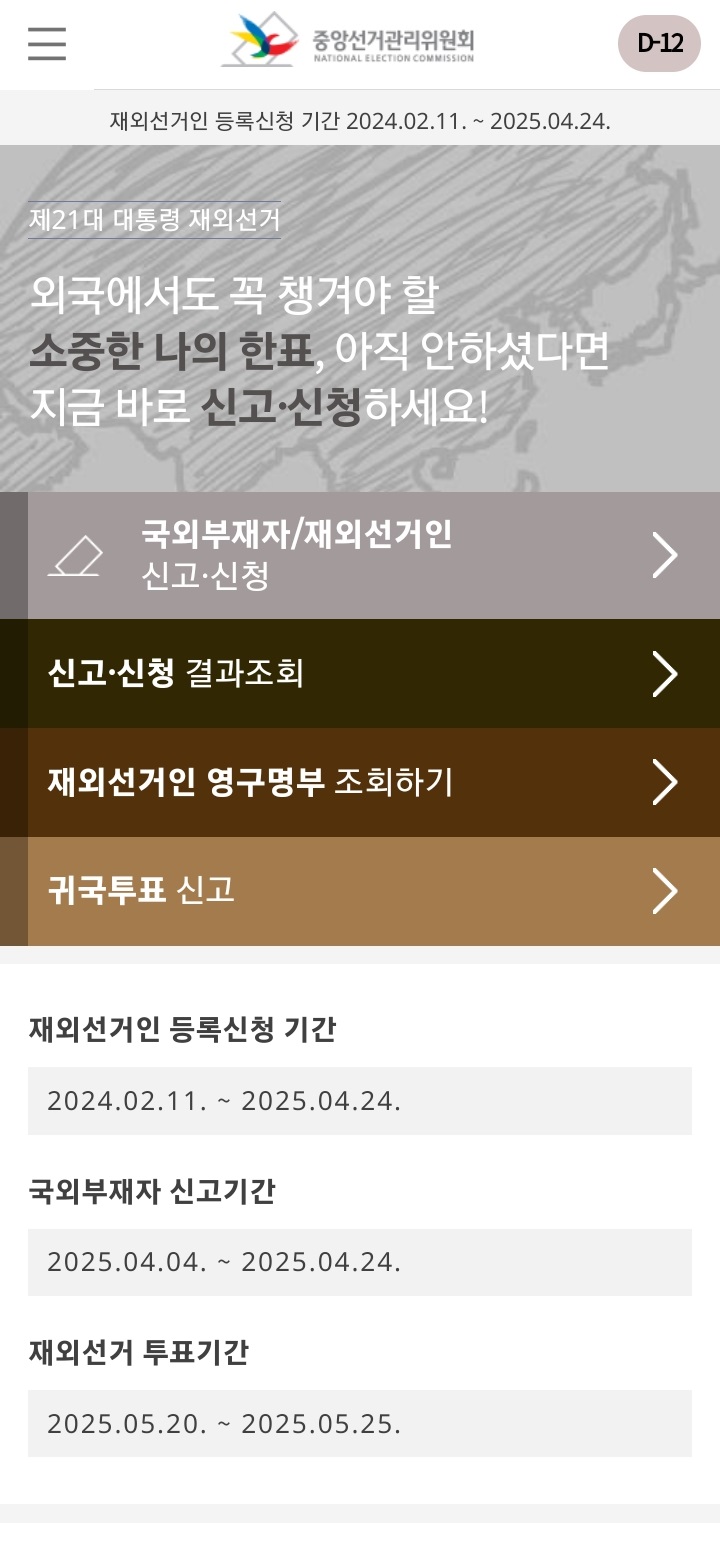 2025년 6월 3일 제21대 대통령 선거가 예정되어 있습니다. 해외에 거주 중인 교민들은 재외선거인 신청을 해야 재외선거를 할 수 있는데요. 재외선거인 등록신청 기간은 2024년 2월 11일부터 2025년 4월 24일까지이며, 국외부재자 신고기간은 2025년 4월 4일부터 같은 달 24일까지입니다. 오늘 기준으로 3일 뒤네요. 재외선거 투표기간은 5월 20일부터 25일까지 6일에 걸쳐 진행될 예정입니다. 해당 절차는 https://ova.nec.go.kr/cmn/main.do 에서 진행할 수 있습니다.