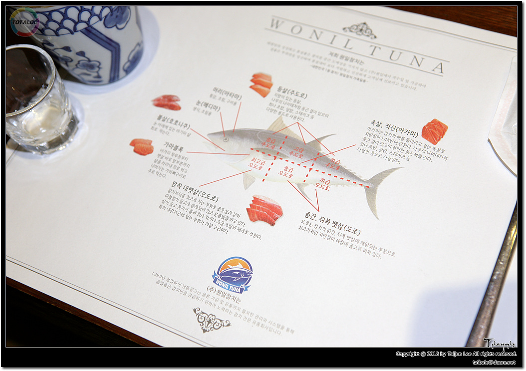 테이블 매트지는 참치 부위에 대한 설명이 나와 있는데요.