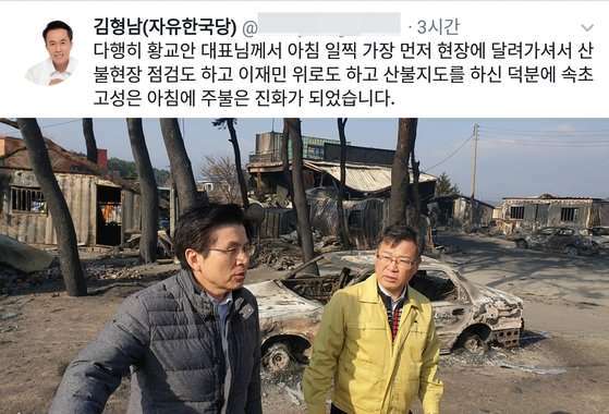 오늘 보도에서 '황교안지킴이 황사모' 밴드의 대표인 김형남 씨(자유한국당원)가 자신의 트위터에 "다행히 황교안 대표가 아침 일찍 가장 먼저 현장에 도착해서 산불 현장 점검도 하고 이재민 위로도 하고 산불 지도를 한 덕분에 속초·고성은 아침에 주불은 진화가 되었다"라고 쓴 것에 대해 진화 작업에 나선 소방관들과 군인, 산림청과 지방자치단체 공무원, 그리고 주민들의 노력을 무시하는 발언이라며 논란이 일기도 했습니다. 아주 김일성 장군님이셔요. 황교안 대표가 뭔데 현장 지도를 했으며, 뭘 황교안 대표 덕분에 주불이 진화가 되었나요. 웃음 밖에 나오지 않지만, 광신도의 특성을 잘 이해하기 때문에 그냥 웃고 넘어갈 수준이었습니다.