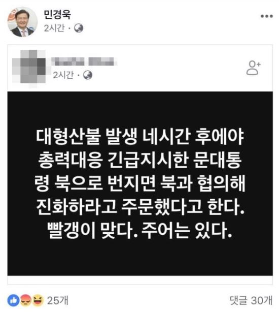 그런데 오늘 포스트의 주인공은 아쉽게도 황교안 대표가 아닙니다. 바로 자유한국당(이하 자유당) 소속 민경욱 의원. 민경욱 의원은 한 네티즌이 쓴 글을 페이스북에 공유했습니다. 그 내용은 문재인 대통령이 산불 대처를 위해 주재한 긴급회의에서 나온 여러가지 지시 중 "산불이 북으로 계속 번질 경우 북한 측과 협의해 진화 작업을 하라"고 말한 것에 관한 내용이었습니다. 민경욱 의원이 공유한 글에는 "대형 산불 발생 네 시간 후에야 총력 대응 긴급지시한 문 대통령 '북으로 번지면 북과 협의해 진화하라'고 주문했다고 한다. 빨갱이 맞다. 주어는 있다"라고 적혀 있었죠.