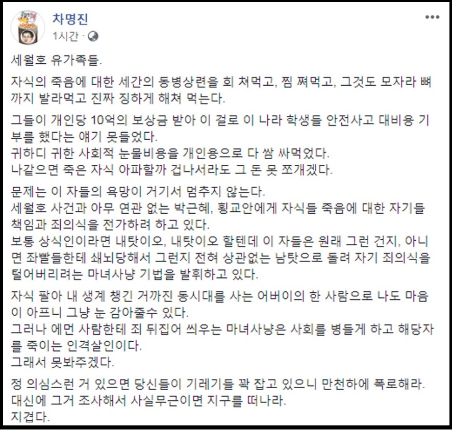이러한 상황에서 차명진이 어제 배설한 막말은 정말 최악의 것이었습니다. 차명진은 세월호 유가족들을 향해 "자식의 죽음에 대한 세간의 동병상련을 회 쳐먹고, 찜 쪄먹고, 그것도 모자라 뼈까지 발라먹고 진짜 징하게 해쳐 먹는다"고 비난을 퍼부었습니다. 또한 "그들이 개인당 10억의 보상금 받아 이걸로 이 나라 학생들 안전사고 대비용 기부를 했다는 얘기 못 들었다"며 "귀하디 귀한 사회적 눈물비용을 개인용으로 다 쌈 싸먹었다. 나 같으면 죽은 자식 아파할까 겁나서라도 그 돈 못 쪼개겠다"고도 주장했죠. 해당 글의 전문은 차명진의 실체를 최대한 알리기 위해 접어두지 않고 펼쳐두겠습니다.