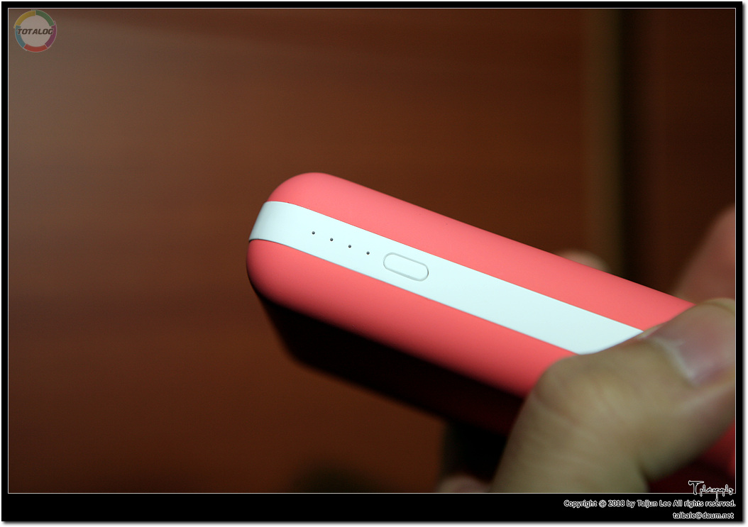 좌측을 보면 배터리 잔량을 확인할 수 있는 LED가 자리하고 있습니다. LED 아래의 버튼을 누르면 불이 들어오는데요. 4개가 점등하면 100%, 3개는 75%, 2개는 50%, 1개는 25% 이하입니다. 한 가지 아쉬운 점은, 노란색과 하늘색 제품은 가운데 라인이 각각 주황색과 파란색인데, 왜 이 제품만 흰색일까요. 빨간색으로 통일하지. 때 탈거 같아...