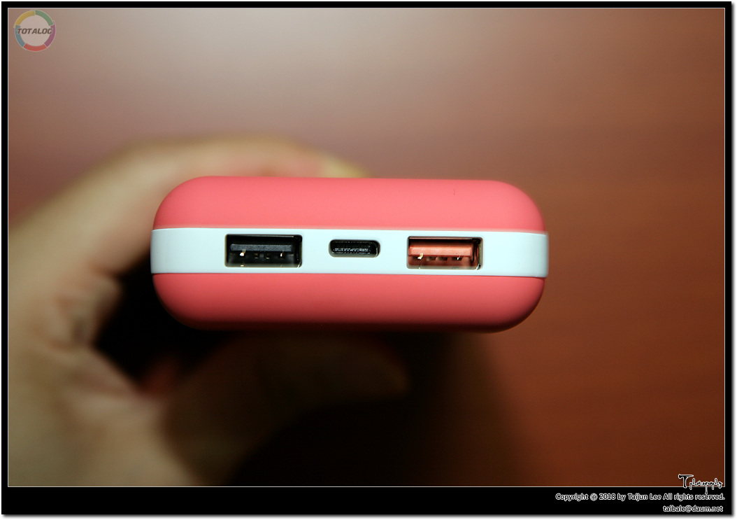 보조배터리 하단부를 보면요. 왼쪽은 일반 충전 USB 포트, 가운데는 전원충전단자 USB TYPE C, 그리고 오른쪽은 급속 충전 USB 포트입니다. 급속 충전을 지원하는 디바이스의 경우 이 포트를 이용하면 되겠죠. 퀄컴 퀵차지 3.0 지원 제품인데, 사실 기술 브랜딩을 번지르르하게 해서 그렇지 결국 전압을 올렸다는 거죠. 하여간 포트가 나뉘어 있으니 한번에 충전을 여러 대 할 수 있는 장점이 있습니다.