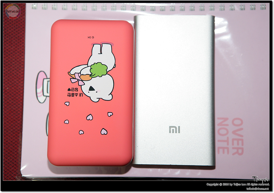 하지만 머큐리의 제품은 젠더 없이도 USB Type-C를 꽂을 수 있다는 점을 비롯해 일반 충전과 급속 충전 포트가 분리되어 있는 점, 가격이 1/10 정도 저렴하고, 무게도 샤오미 버전(250g)에 비해 머큐리 버전(230g)이 1/10 정도 가볍기도 하고, 더욱이 샤오미 버전의 저 디자인들이 제품에 직접 인쇄된 것이 아니고, 인쇄된 비닐류에 배터리가 쌓여져 있다는 글을 봐서요. 사용하다가 너덜거릴 것 같은 예감. 그리고 저도 샤오미 5,000mAh 제품을 사용하고 있지만, 가방 속의 다른 전자제품들에게 흉기로 작용될 수 있다는 점 등이 마음에 걸렸습니다. 물론 이 점은, 보조배터리만을 봤을 때 내구성이 좋다는 말이 될 수도 있지만! 전 약간 마음에 걸렸어요. 다른 전자제품에 샤오미 보조배터리가 해를 끼친 케이스를 경험한 터라... 아 근데 오액토가 그네타고 있는 디자인이 정말 갖고 싶었단 말이죠. 만약에 제품에 직접 인쇄된 거였다면 다 무시하고 그냥 샀을텐데..