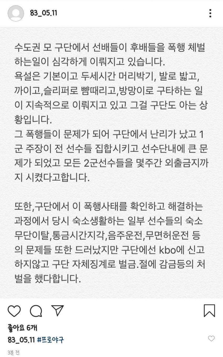 SSG 랜더스의 구단 내 폭행 사건은 이번이 처음이 아닙니다. 팀이 SK에서 SSG로 인수되기 전인 2020년, SK 와이번스 2군 내에서 단순 폭행의 수준을 넘어 2~3시간이 넘도록 머리박기, 발로 밟기, 슬리퍼로 뺨때리기, 방망이 구타 등이 자행되었죠. 당시 1군 주장이었던 최정이 전 선수를 집합시켜 모든 2군 선수들에게 몇 주간의 외출금지를 내렸구요.