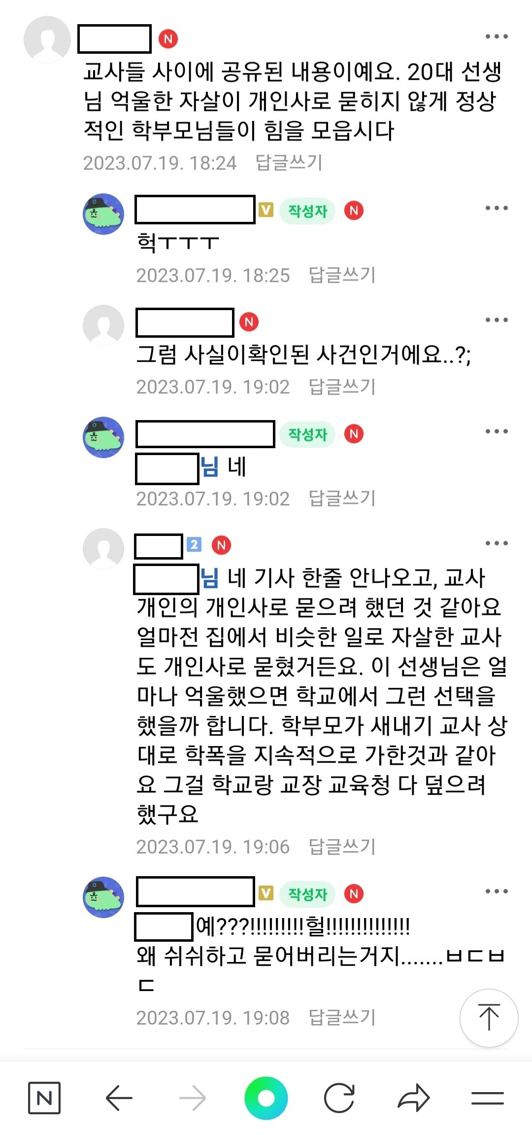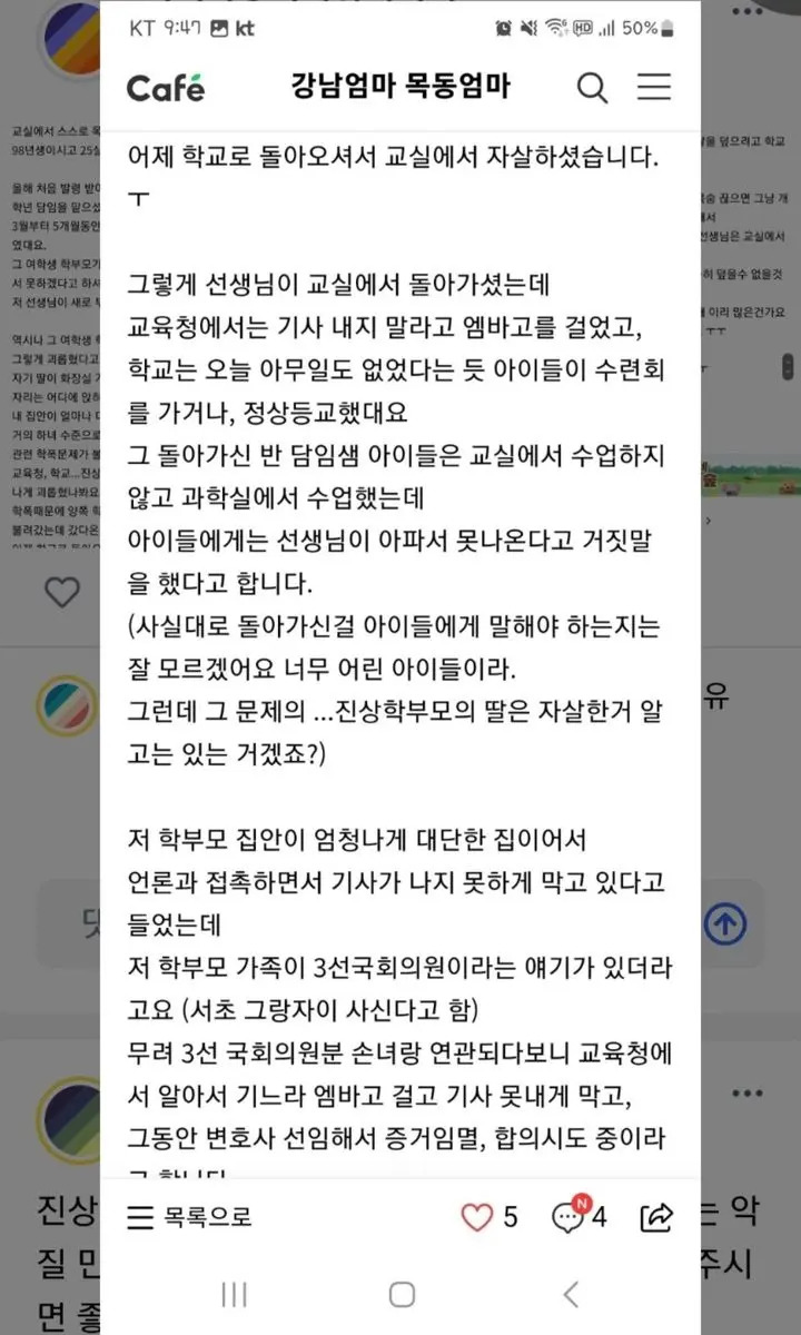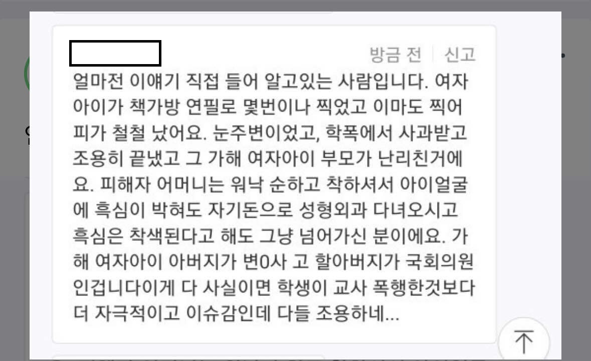 그런데 실시간으로 관련 맘카페 게시글이 지워지거나 관련 기사가 내려간 경우가 목격된 것을 비롯해 18일 오전에 일어난 사건이 19일에야 보도되어 하루 동안 입막음이 진행되었다는 이야기 및 학부모가 언론사와 지속적으로 접촉 중이라는 확인되지 않은 이야기가 떠돌고 있습니다. 맘카페 '강남엄마 목동엄마'에는 해당 여학생 학부모가 평소 "딸이 화장실 가는 거 수시로 체크해서 알려라" "자리는 어디에 앉혀라" "내 집안이 얼마나 대단한지 아느냐" 등 하녀 수준으로 교사 A씨를 괴롭혔고, 학생 B와 C 사이의 학폭 사건으로 인해 양쪽 학부모에게 시달리다가 교육청에 불려갔다온 다음날 학교로 돌아온 후 교실에서 자살했다는 내용이었죠. 이는 블라인드에 올라온 한 네티즌의 글과도 일치하는데요. 자신이 교사라고 밝힌 이 네티즌에 의하면 서울시교육청 장학사가 17일 A교사를 호출해 혼을 냈고, 그 다음날 아침 A교사가 극단적인 선택을 한 것인데, 아이들은 등교 후 사망한 A교사의 시신과 한 교실에 있었다고 적었죠.