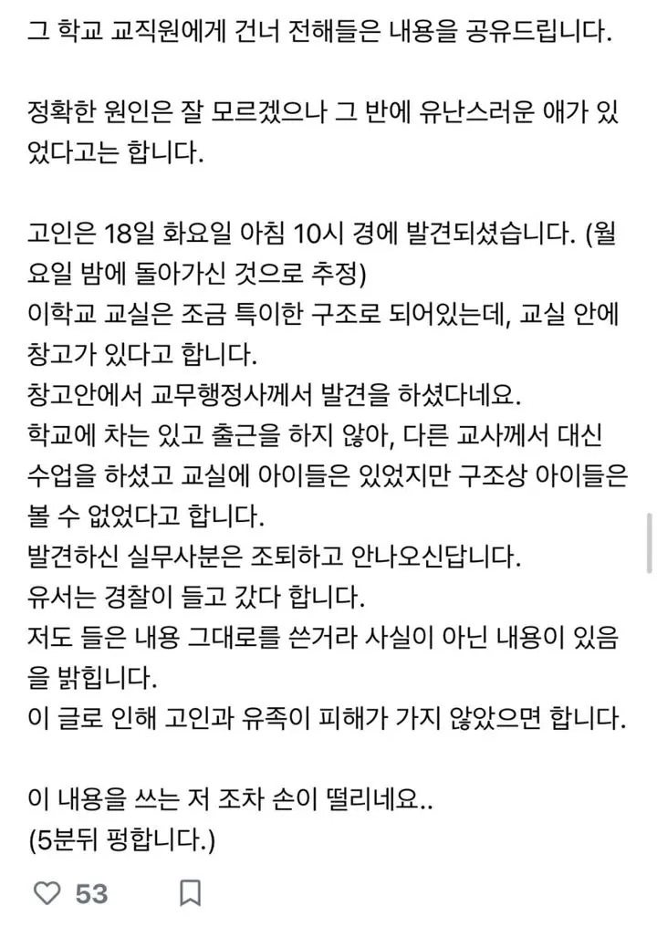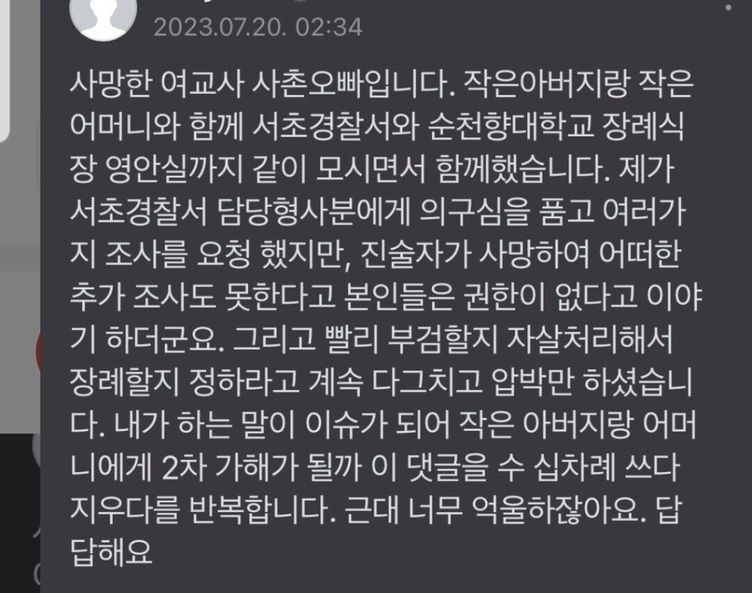 아이들이 등교 후 사망한 A교사의 시신과 한 교실에 있었다는 내용에 뜨악하실 수 있는데요. 제가 입수한 내용 또 하나의 글이 있습니다. 이 글을 올린 사람의 주장에 따르면, 교사 A씨는 18일 화요일 아침 10시 경에 발견됐다고 합니다. 서이초등학교의 교실은 교실 내부에 창고가 있는 약간 특이한 구조로 되어 있었고, 창고 내에서 교무행정사가 발견을 했다고 합니다. 학교에 차는 있는데 출근을 하지 않아, 다른 교사가 대신 수업을 했고, 아이들이 사망한 A교사를 볼 순 없었지만, 어쨌든 한 교실 안에 사망한 교사 A씨와 함께 있었다는 거죠. 이를 발견한 교무행정사는 조퇴를 했으며, 유서는 경찰이 들고 갔다고 하구요. 만약 이 내용이 맞다면 서울시교육청 측이 거짓말을 한 것이 되겠죠. 반드시 사실 확인이 필요한 부분입니다.