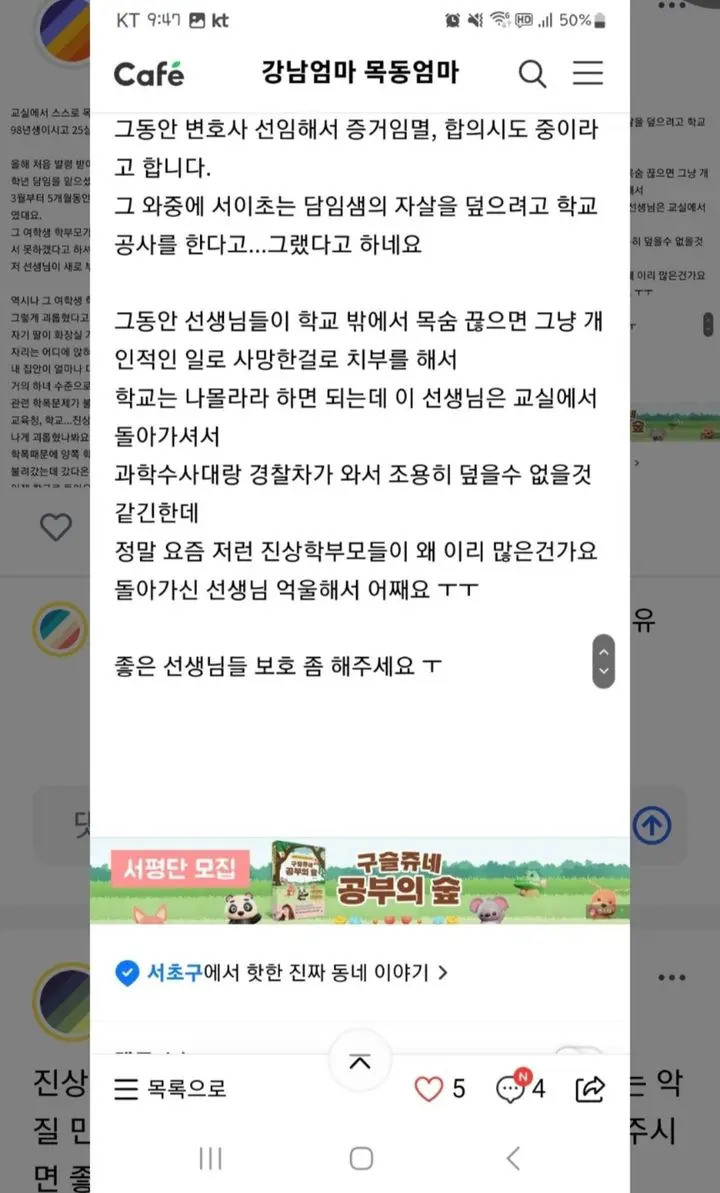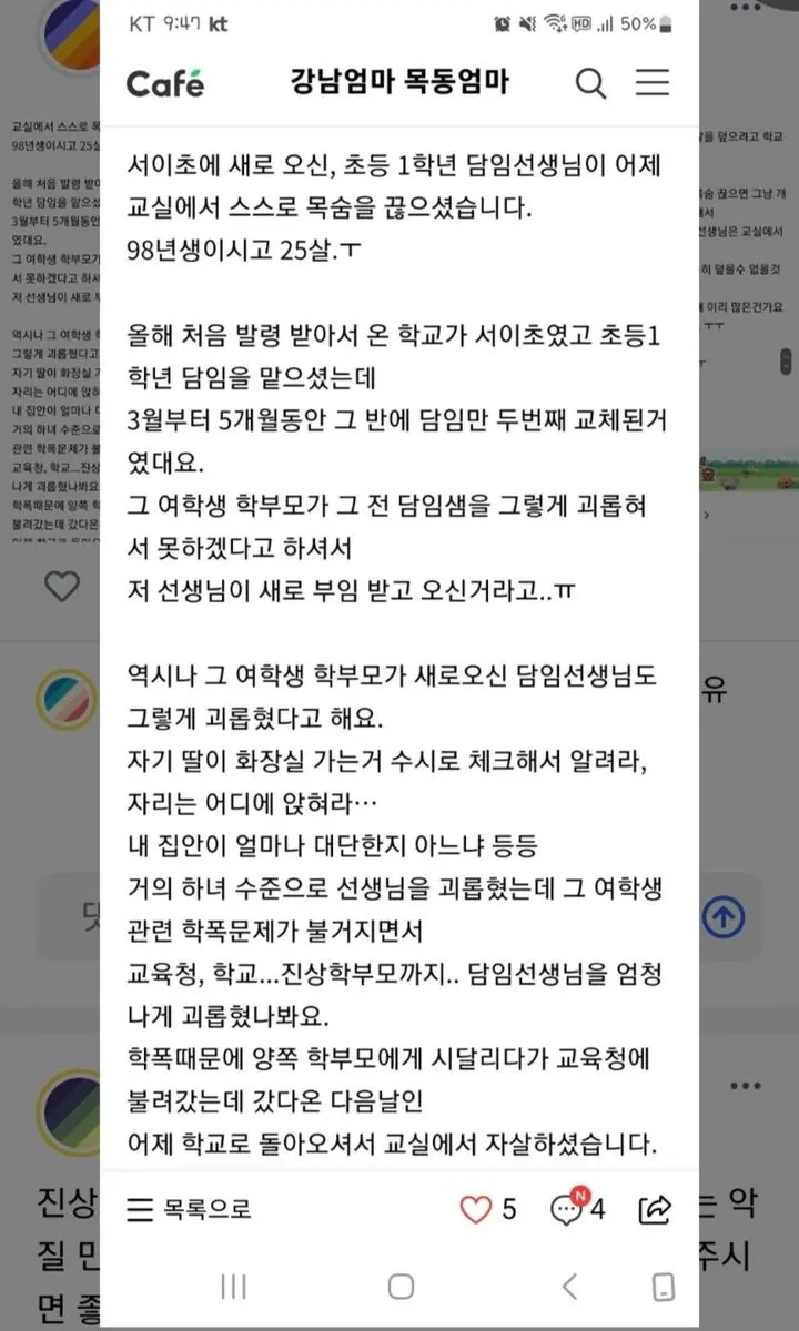 너무 안타까운 사실은 극단적인 선택을 한 교사 A씨가 불과 23세 밖에 되지 않았었다는 점. A씨의 부모에게는 A씨 역시 아직 생때같은 소중한 자식일텐데, 한 때 교직에 뜻을 품고 교육대학원을 졸업한 저로서는 이번 소식이 더더욱 가슴 아픈 소식입니다. 제가 교직의 꿈을 최종적으로 포기한 이유도 결국 무너진 교권 때문이었거든요. 한켠에서는 업무 스트레스로 자택에서 자살한 교사가 순직 처리되지 못했다는 기존 사례 때문에 학교에서 죽었다는 주장도 있다는데, 이러한 주장 자체만으로도 무너진 교권의 현 상황에 가슴이 너무나도 답답해네요.