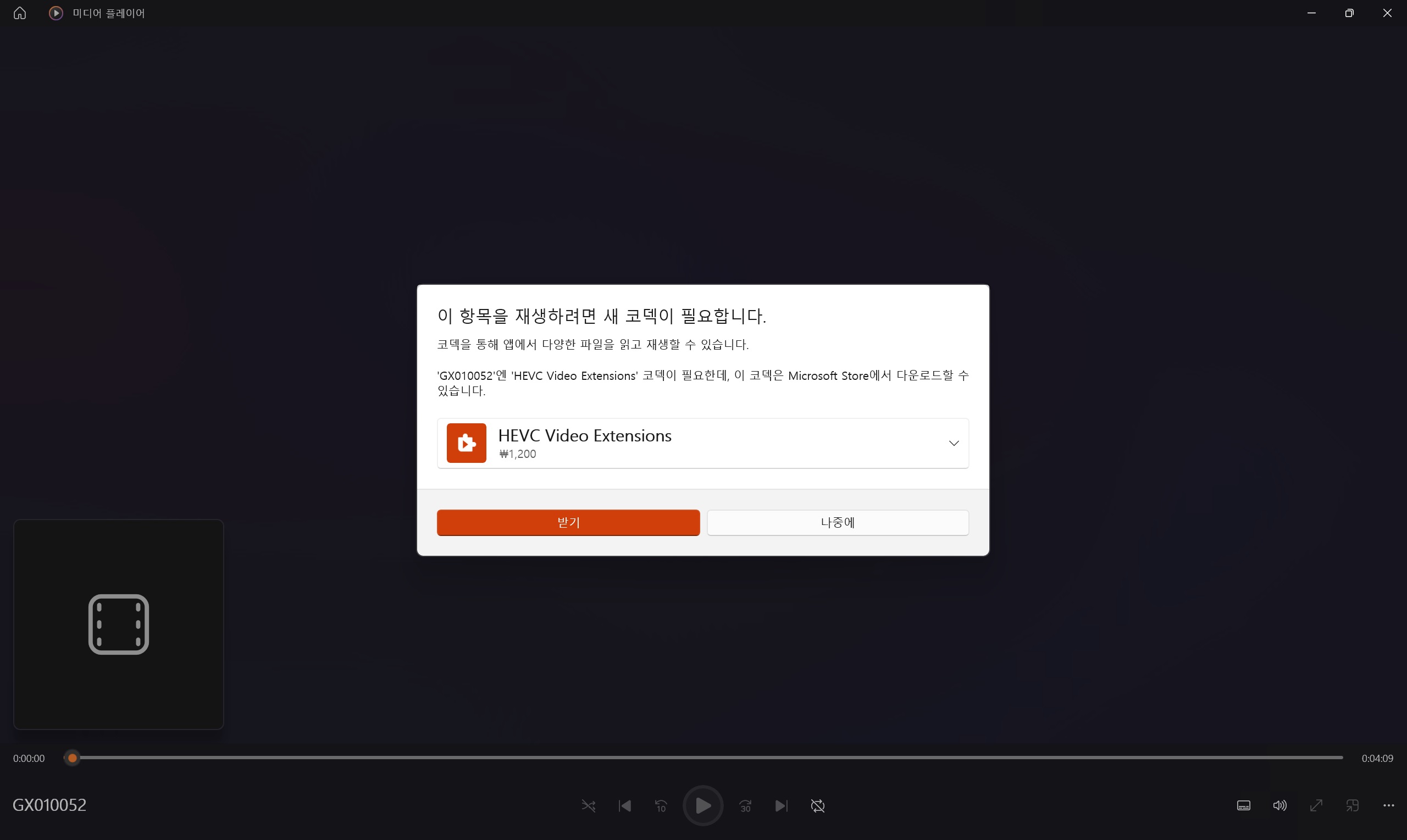 컨펌을 하기 위해서 윈도우 미디어플레이어로 재생을 시켜봤더니 딱 이렇게 창이 뜨네요. 코덱이 필요한 것이 맞았었습니다. HEVC Video Extensions이 필요하다고 안내가 뜨는데, 1,200 원이군요.