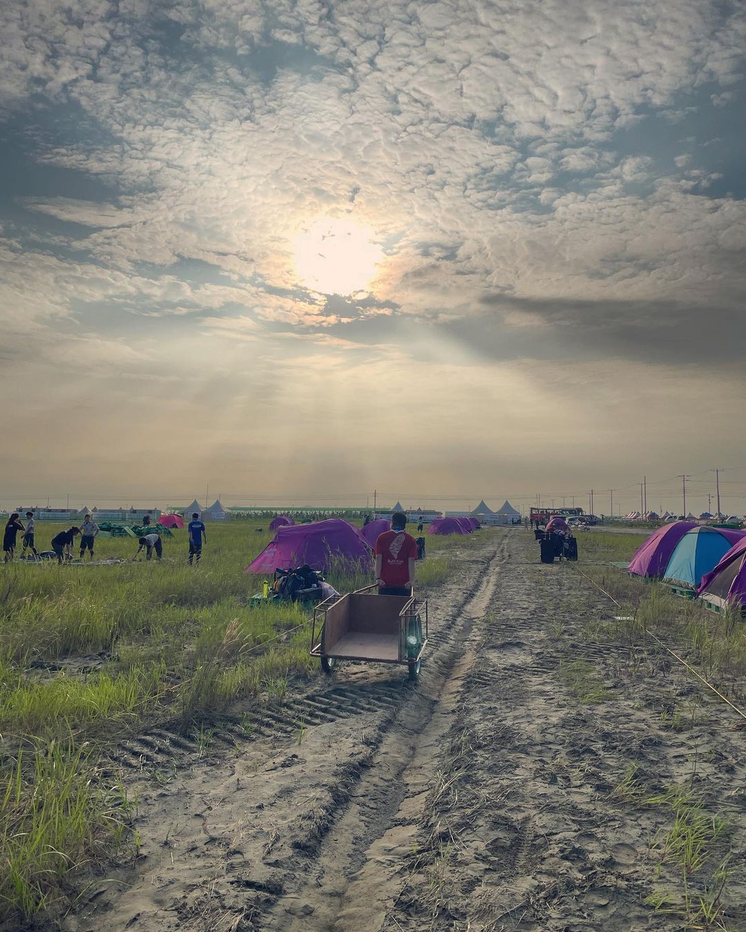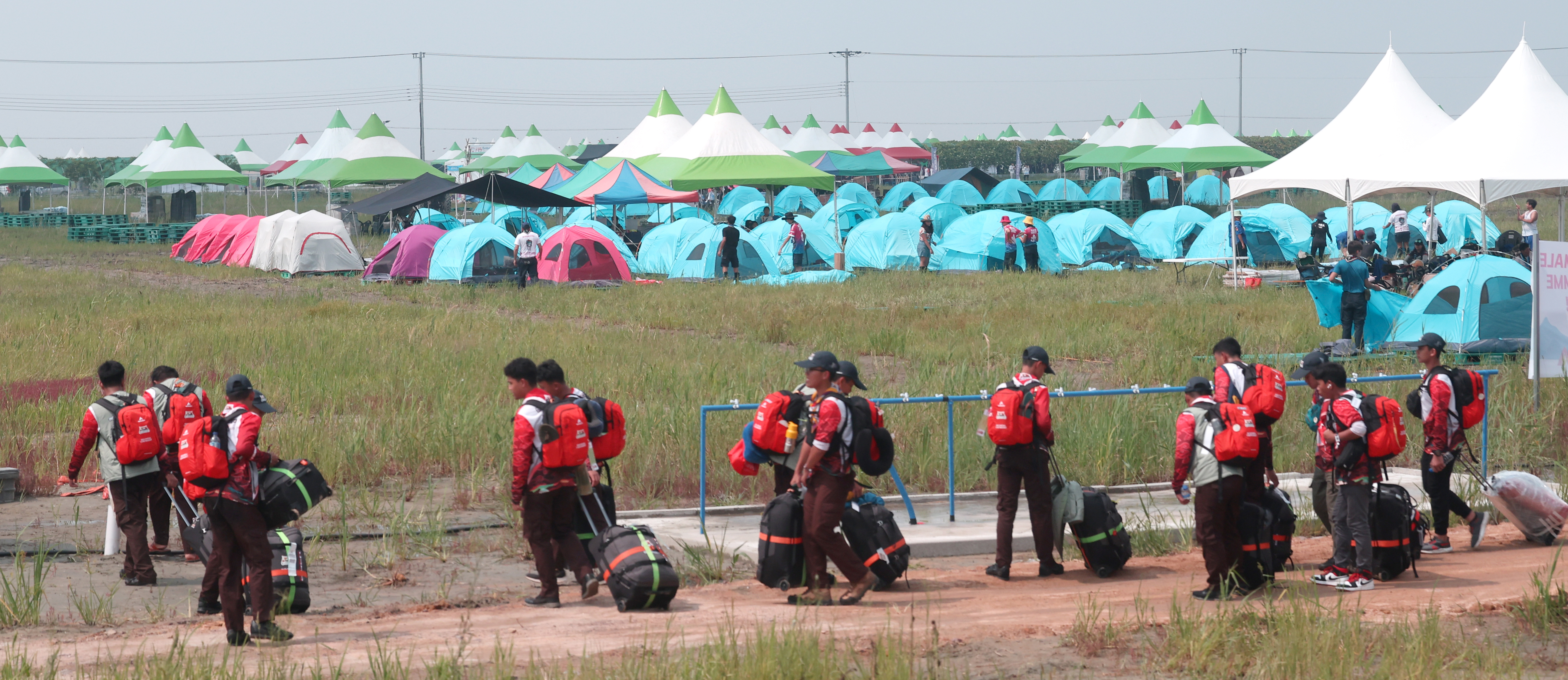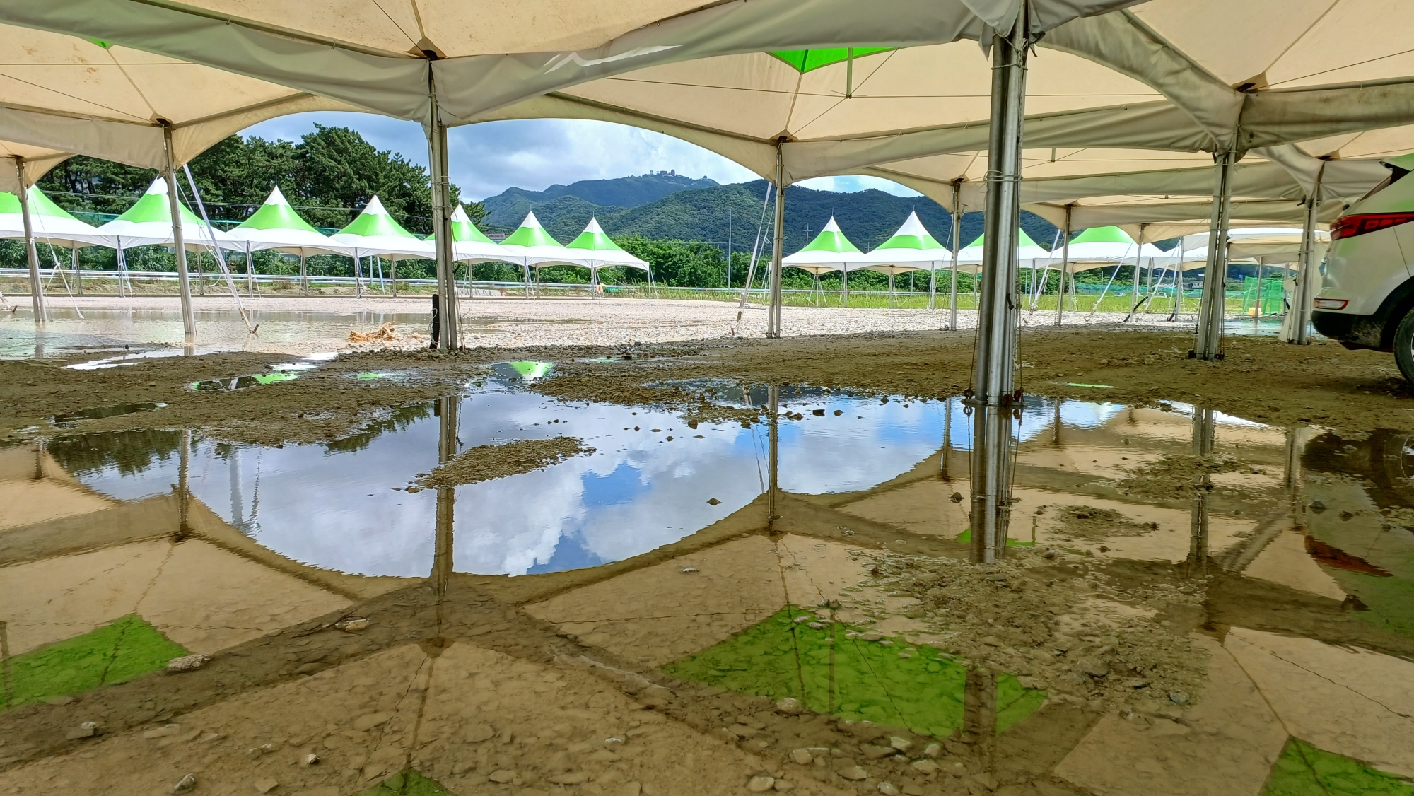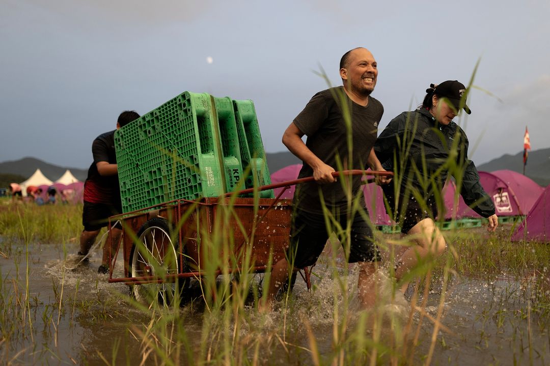 하지만 예고된대로 대회 일주일을 남겨둔 뒤 찾아온 장마로 인해 집중호우가 쏟아지면서 대회장이 그야말로 뻘밭으로 변해버린 것. 텐트를 치기는커녕 걷기도 힘들 지경이 된 상황에서 주최 측은 부랴부랴 화물 운송용 깔판인 파렛트 10만 개를 투입합니다. 그마저도 참가자들이 셀프로 설치해야 했구요. 이쯤되면 12일간 간척 사업하러 온 게 아닌가 싶은.. K-리어카