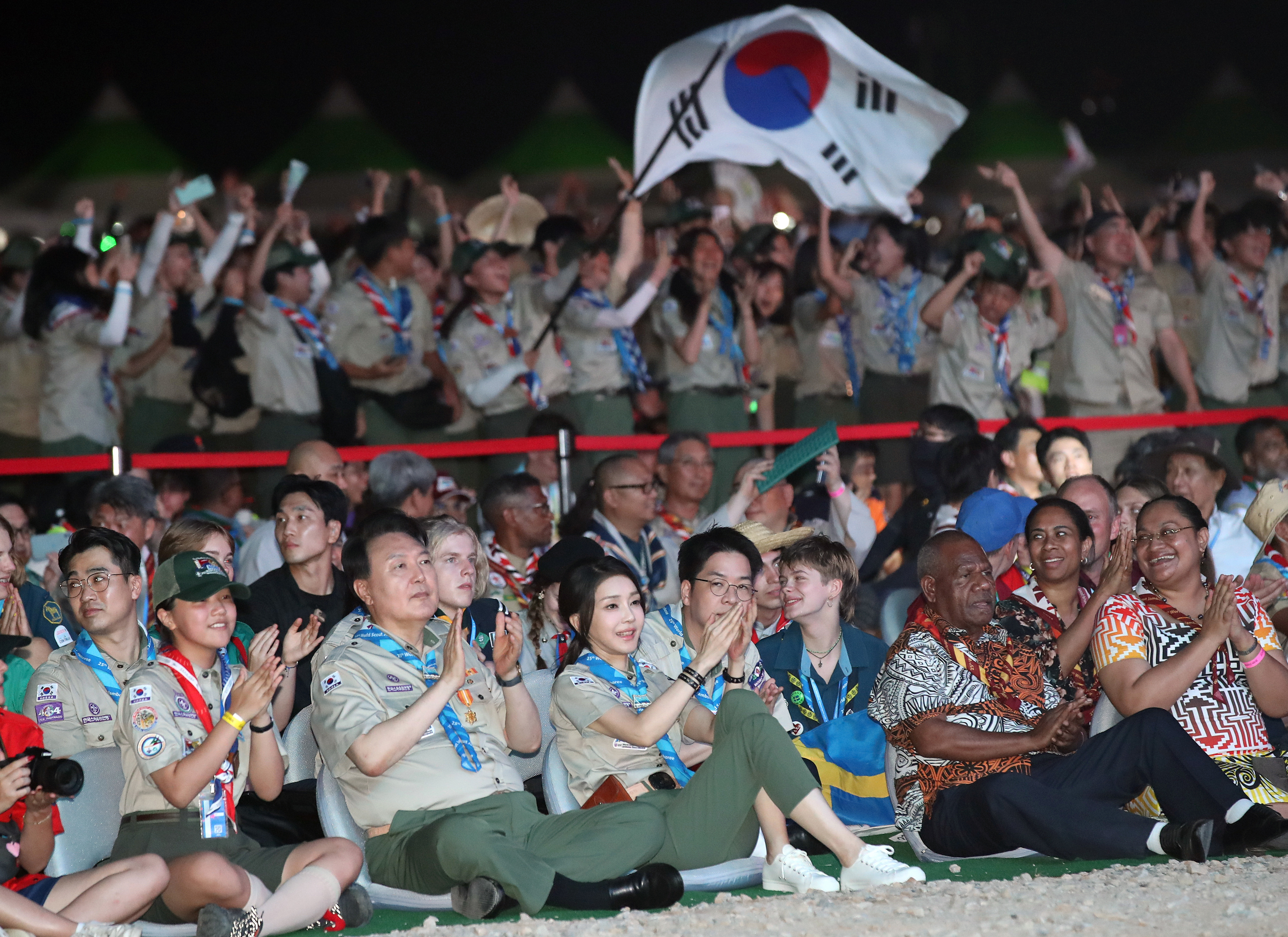 새만금 세계잼버리 일정은 1일부터 시작되었지만 개영식은 어제(2일) 잼버리장 내 델타 구역에 위치한 대형 무대에서 있었습니다. 이 자리에는 윤석열 대통령도 영부인 김건희 여사와 함께 참석했는데요. 스카우트 대원 출신 최초의 대통령이기도 한 윤석열 대통령은 스카우트 복장을 입고 김건희 여사와 함께 개영식장에 들어선 뒤 종이비행기 퍼포먼스를 함께 했고, "저 역시 어린 시절의 경험이 인생을 살아가는 데 큰 힘이 됐다"며 "친구와 동료의 어려움을 외면하지 않고 먼저 손을 내미는 멋진 스카우트가 되길 바란다"고 참가자들을 응원했습니다.