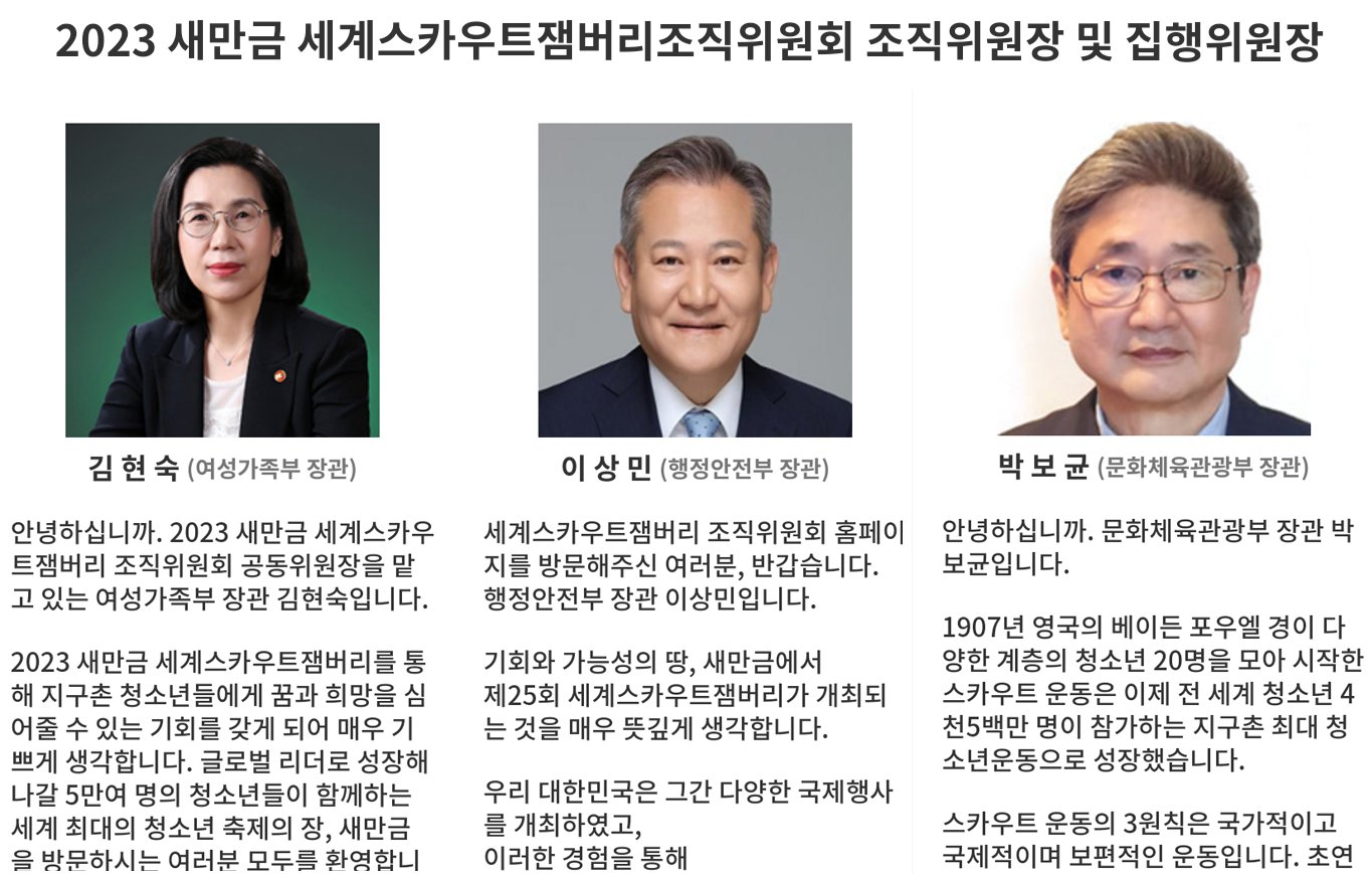 하지만 애석하게도 이번 새만금 잼버리 조직위원회 공동 위원장 5명 중 3명이 윤석열 정부 인사인 이상민 행정안전부 장관, 박보균 문화체육부 장관, 김현숙 여성가족부 장관이라는 점은 대통령실 관계자의 문 정부 탓을 궁색한 변명으로 만들어 버리기에 모자람이 없습니다.