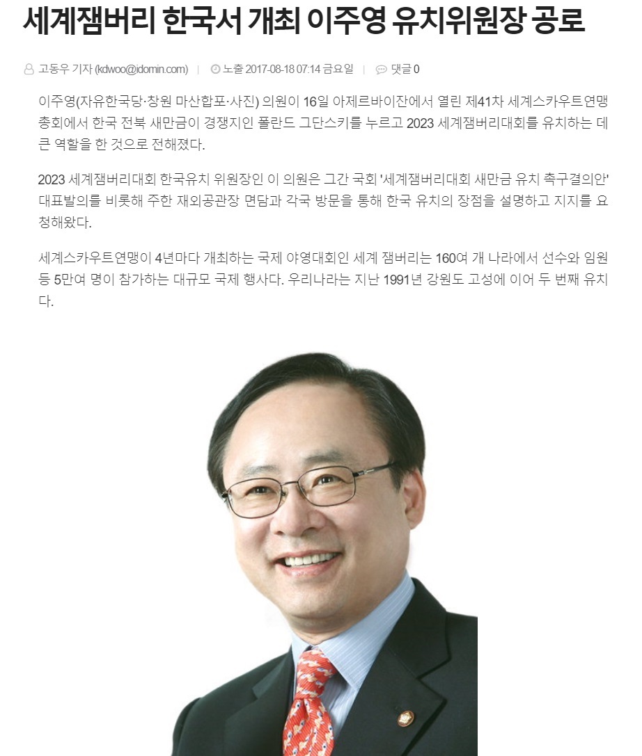 - 새만금 세계잼버리 유치의 '공로자' 새누리당 이주영 의원 (2023 세계잼버리대회 한국 유치위원회 위원장)