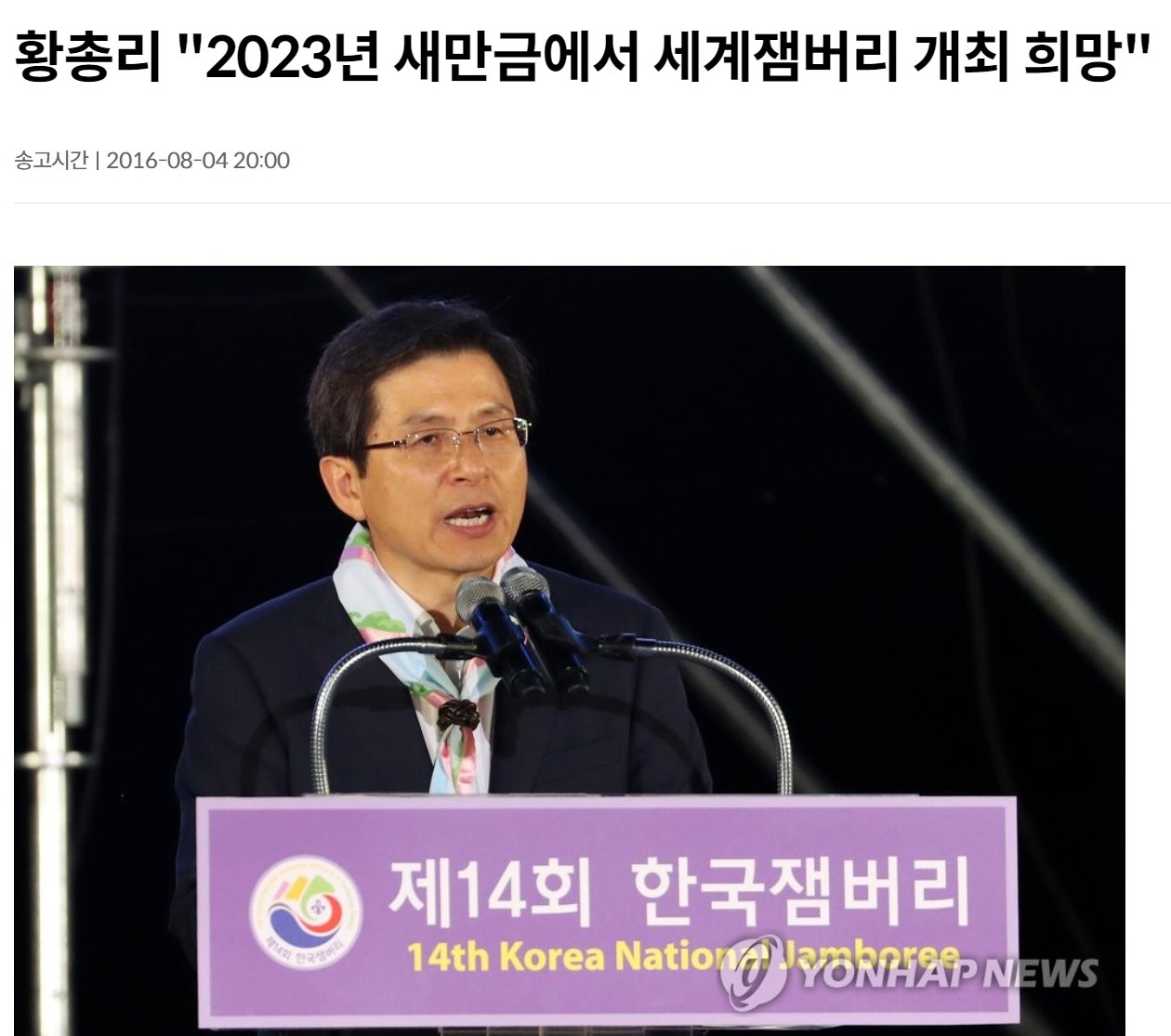 그런데 박근혜 정부를 비롯해 당시 여당이자 국민의힘과 자유한국당의 전신 새누리당에서 평소 안하던 짓을 하기 시작합니다. 2016년 3월 정부가 이를 국제대회로 승인하면서 공식적으로 정부 지원을 받을 수 있는 길을 열더니 8월에는 박근혜 전 대통령이 대구 달성군에서 열린 제14회 한국잼버리에 영상 메시지를 보내 "성공적인 잼버리를 위해 지원을 아끼지 않을 것"이라며 새만금 세계잼버리 유치를 직접 언급하기에 이르렀죠. 황교안 당시 국무총리도 개영식에 직접 참석해 축사 도중 "새만금에서 세계 잼버리가 펼쳐진다면 지구촌 청소년들에게 용기와 희망, 불굴의 도전정신을 심어줄 수 있을 것"이라고 강조하며 새만금 세계잼버리에 대한 각국의 성원을 부탁하기도 합니다.