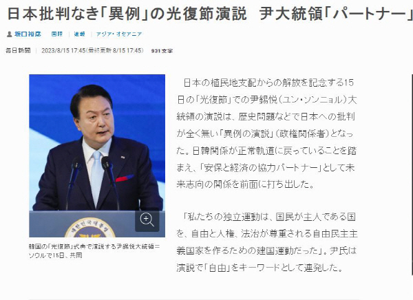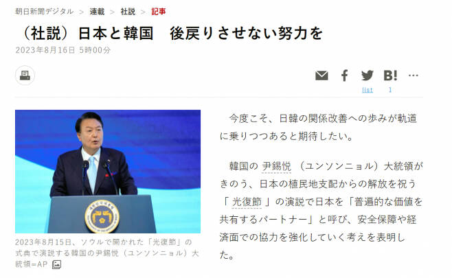 이번 윤석열 대통령의 연설에 대해 일본에서조차 놀라워하는 분위기입니다. 16일 아사히 신문은 '일본과 한국, 후퇴하지 않게 노력을'이라는 사설을 통해 "윤 대통령이 일본의 식민 지배로부터 해방을 축하하는 광복절 연설에서 일본을 '보편적 가치를 공유하는 파트너'라고 부르며 안보와 경제면에서 협력을 강화해 나가겠다고 밝혔다"며 "이번에야말로 한일 관계 개선 행보가 궤도에 오르고 있다고 기대한다"고 밝혔고, 마이니치 신문은 "일본에 대한 비판적인 발언은 전혀 없었다"면서 "한일 관계가 정상 궤도로 돌아오고 있는 것을 근거로 일본을 안보와 경제 협력 파트너로서 미래 지향적 관계를 내세웠다"고 분석했습니다.