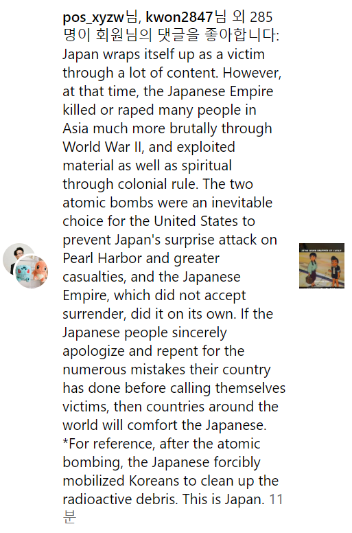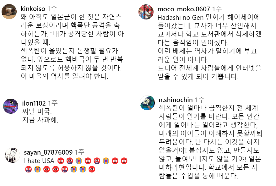 많은 일본 네티즌들은 해당 영상을 인스타그램 등 SNS를 통해 바이럴하면서 일본이 이렇게 참담한 원폭 피해를 입었다고 홍보하기 시작했습니다. 그러면서 '미국은 정말 나쁘다' '우리 일본은 평화를 사랑한다. 이러한 비극이 일본을 마지막으로 다시는 발생하지 말아야 할 것이다' 등 정말 눈을 뜨고는 참기 힘들 정도로 피해자 코스프레가 난무했죠.