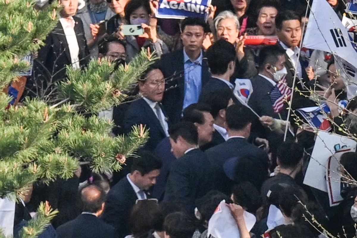 윤석열 전 대통령이 모습을 드러내기 전, 관저 입구 앞에서는 유튜브 채널 '신의한수'가 주최한 집회인원 약 500명 규모의 집회가 한창이었습니다. 그런데 윤석열 전 대통령이 나타날 것으로 알려졌던 오후 5시가 얼마 남지 않은 4시 40분경, 마이크를 잡고 있던 진행자 신혜식이 경호처의 요청이라며 "선착순으로 20·30·40 청년 200명에게 가까이에서 윤석열 대통령을 환송할 수 있는 기회를 제공하겠다"라고 말했습니다. 경찰 바리케이드를 따라 각종 문구가 적힌 피켓과 태극기, 성조기를 든 참가자들이 200명 안에 들기 위해 줄을 섰고, 이렇게 '선택받은' 지지자 200명은 윤석열이 나타나기까지 메가폰을 든 다른 지지자의 선창에 따라 "Yoon Again(윤 어게인)", "대통령 윤석열, 우리가 지킨다" 같은 구호를 외치며 윤석열의 등장을 기다렸죠.