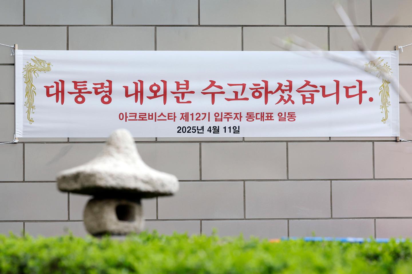 하지만 사실 아크로비스타에서는 오전부터 한바탕 소란이 있었습니다. 1층 현관 부근에 대통령의 상징인 봉황 문양과 함께 "대통령 내외분 수고하셨습니다"라는 동대표 일동 명의의 현수막이 붙자 일부 주민들이 "왜 주민 동의 없이 이런 것을 붙이느냐"고 관리사무소에 항의한 것. 관리사무소는 "동대표들이 개인적으로 붙인 것이라 막을 수 없었다. 재물손괴로 고발당할 수 있어 뗄 수도 없다"고 했고 주민들은 "동대표들 개인 명의로 붙이라고 해라"라고 항의했다고 합니다. 한 주민은 "외부인이 보기에 아크로비스타 757세대가 전부 윤 전 대통령을 환영하는 것으로 보이지 않겠느냐"고 우려했죠.