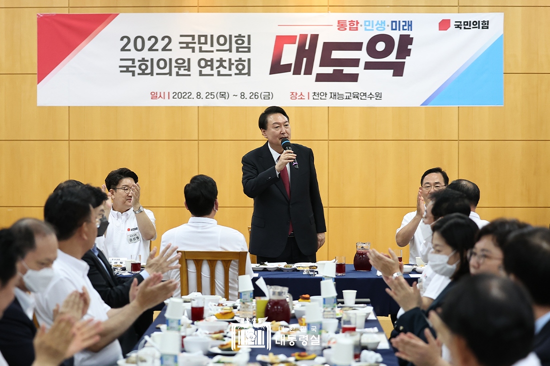 (윤) 그리고 일반 국민들이 당원으로 막 지금 민주당이 100만이고 국힘은 27만이에요. 그러면 국힘에 한 100만 이상 당원으로 들어와 주시는 거야. 응? 그렇게 해 가지고 국힘은 없는 겁니다. 그러니까 바꿔버리는 거예요. 이 당을..