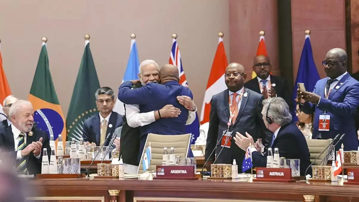 G20 정상회의 개회 연설에서 "AU에 영구적인 정회원 지위를 부여하는 것에 대해 회원국들이 찬성했다"고 말한 모디 총리는 AU 의장인 아잘리 아수마니 코로모 대통령을 회의장 테이블로 초청해 그와 포옹을 했습니다. 이번 AU의 가입으로 인도가 글로벌 사우스의 맹주 입지를 굳혔다는 평가가 있습니다.