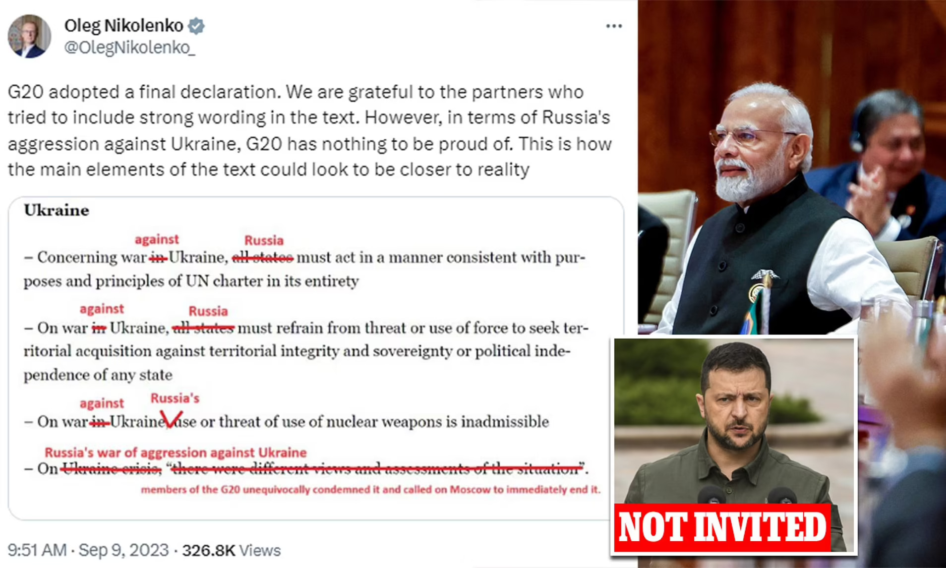 우크라이나 전쟁을 두고 미국 및 서방 회원국들은 지난해 인도네시아에서 열렸던 2022 G20 발리 정상회의 때 합의된 것보다 더욱 강력한 표현을 사용해 러시아의 책임을 묻는 것을 비롯해 전쟁을 강력히 비판하는 내용이 공동선언에 들어가야 한다고 주장했고, 러시아 및 중국은 G20이 전쟁을 논의하는 포럼이 아니라고 대응했습니다. 이러한 상황에서 비동맹 중립 외교노선의 전통을 고수하며 우크라이나 전쟁에 대한 중립을 지켜온 인도가 적극적으로 중재에 나서 전쟁 관련 표현을 완화하는 방식으로 타협이 이루어졌죠.