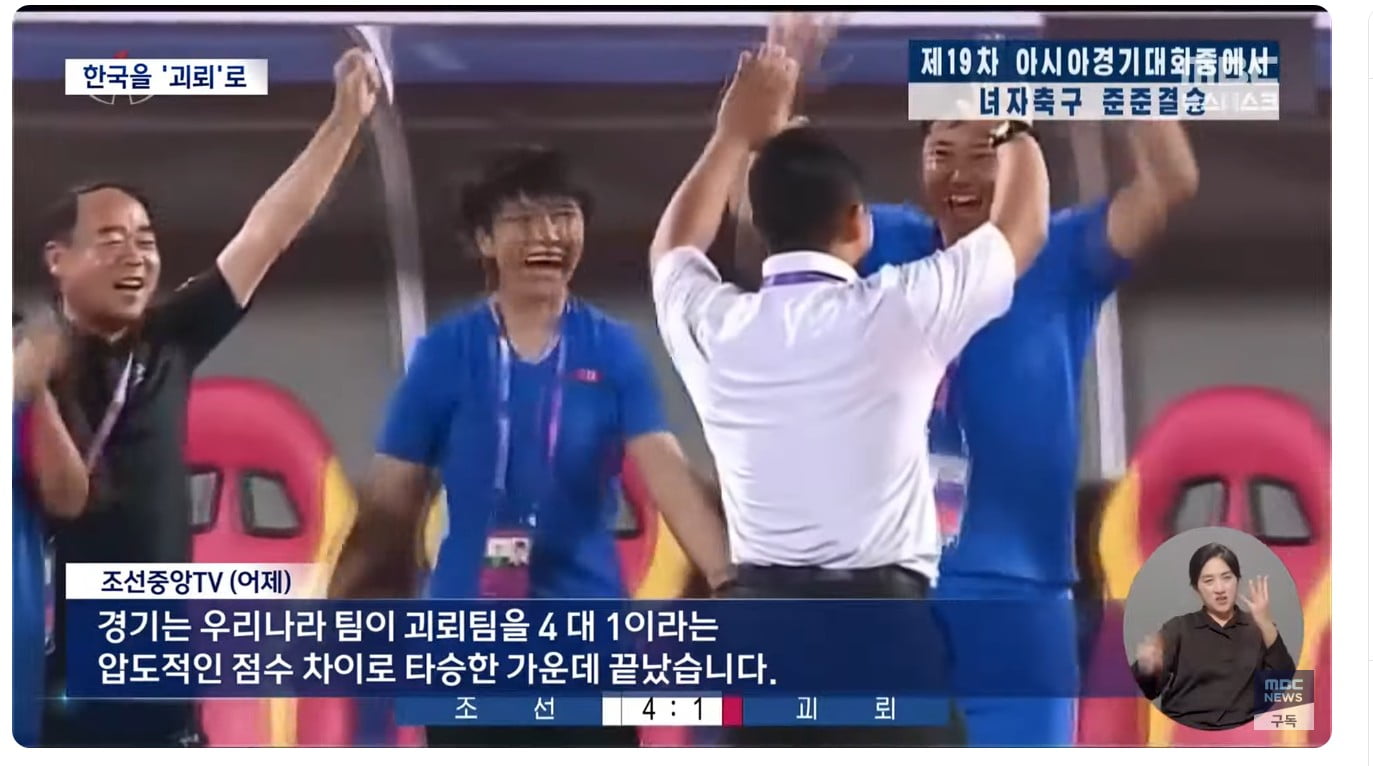 북한이 항저우 아시안게임 남북 여자축구 8강전 관련 내용을 보도하면서 남한을 '괴뢰'라고 표기한 것에 대해 국민의힘이 발끈하고 나섰습니다. 국민의힘 김정식 청년대변인은 4일 논평을 통해 "대한민국 이북 지역을 무단 점거 중인 집단이 한반도 유일의 합법정부인 대한민국을 괴뢰라 칭하기 시작했다"며 "허수아비, 꼭두각시를 뜻하는 괴뢰라는 단어에 북괴만큼 어울리는 집단이 어디 있나"고 말했습니다.