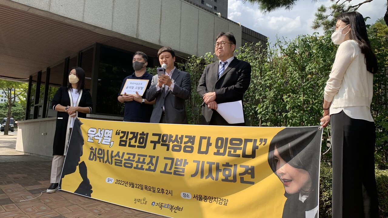개신교 단체 평화나무 기독교회복센터는 지난 8일 서울 서초구 서울중앙지검 앞에서 기자회견을 열고 "윤석열은 당시 무속 논란에 따른 기독교계 표심을 의식하고 지지층을 붙잡기 위해 김 여사가 기독교 신앙이 매우 깊다는 것을 의도적으로 어필했다"며 "선거에 당선될 목적으로 허위사실을 발언한 것"이라고 지적했습니다.