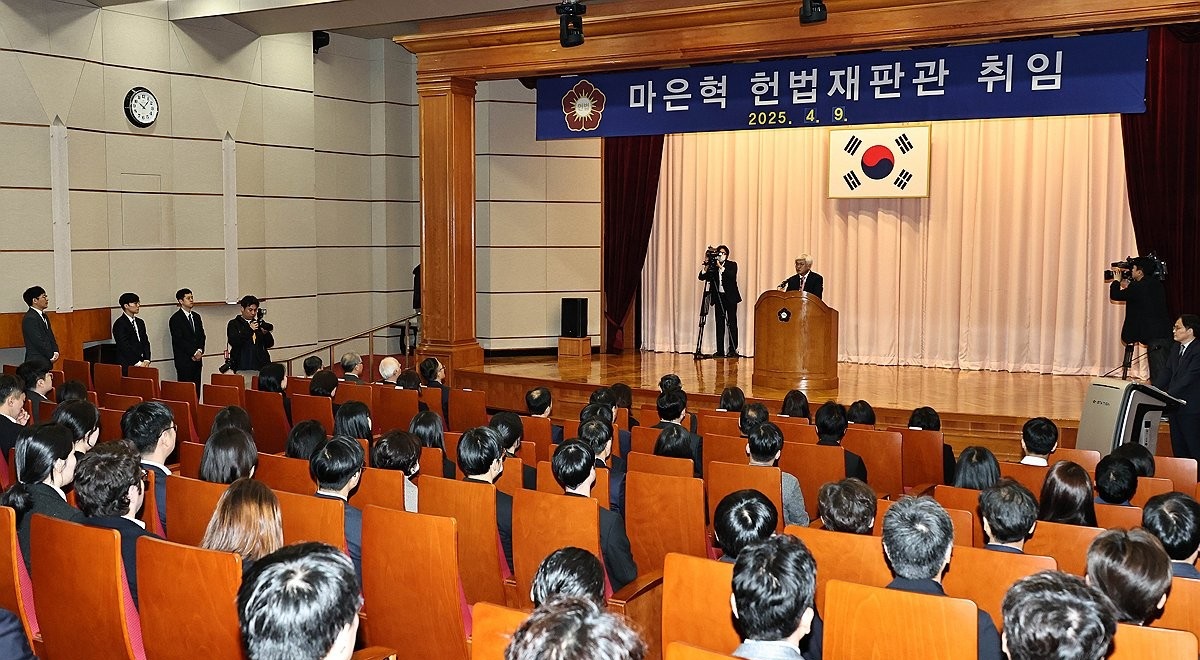 마은혁 신임 헌법재판관의 취임식이 9일 오전 헌법재판소에서 열렸습니다. 마은혁 신임 헌법재판관은 이날 취임 과정에서 정치권 일각을 중심으로 제기된 '이념 편향' 우려와 관련해 앞으로 국민이 걱정하지 않도록 헌법재판에 임하겠다고 밝혔습니다. 마은혁 재판관은 취임식에서 "저의 헌법재판관 임명과 관련해 우리 사회에 우려하는 시선이 있다는 것을 잘 알고 있다"며 "그분들이 걱정하지 않도록 오로지 우리 헌법이 규정하는 가치들인 국민주권주의, 자유민주주의, 법치주의, 사회국가원리 등 헌법의 기본원리만을 기준으로 삼아 헌법을 해석하겠다"고 말했습니다.