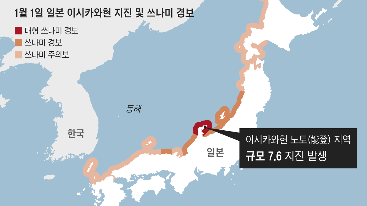 새해 첫 날인 오늘 오후 4시 10분, 일본 이시카와현 노토 지역에서 규모 7.6의 지진이 발생했습니다. 이에 따라 일본 기상청은 야마가타, 니카타, 도야마 등 우리나라 동해 쪽과 접한 일본 서해안 대부분 지역과 북동부 일부 지역 해안가에 쓰나미 경보 및 주의보를 발령했고, 이시카와 현에는 최대 높이 5m에 육박하는 쓰나미가 발생했는데요. NHK 등 일본 언론에 따르면 이번 지진은 2011년 동일본 대지진 이후 쓰나미의 높이가 가장 높은 수준이었다고 합니다. 도쿄에서도 진도 3의 흔들림이 관측됐다고 하구요.