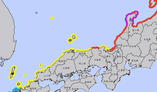 지도를 살펴보면 규모 7.6의 지진이 발생한 이시카와현 노토 지역엔 '대형 쓰나미 경보'로 보라색, 후쿠이·사도·도야마 현 등에는 '쓰나미 경보'로 붉은색이 표시되어 있습니다. 그리고 홋카이도 및 돗토리현 등에는 '쓰나미 주의보'로 노란색이 표시되어 있는데, 독도 또한 노란색으로 표시가 되어 있던 것. 사실 이건 어제 오늘 일이 아닙니다. 일본 기상청은 그동안 쭉 일본 정부 입장을 반영해 독도를 자국 영토로 포함시켜 각종 기상 예보 등을 해왔죠.