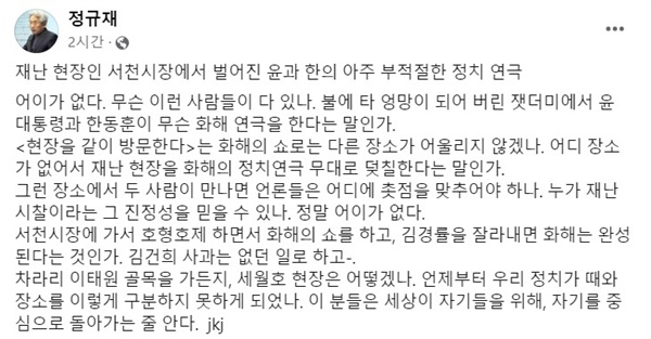 보수 존객의 눈에도 이 상황이 어처구니가 없었나 봅니다. 정규재 전 한국경제 논설위원은 "난 현장인 서천시장에서 벌어진 윤과 한의 아주 부적절한 정치 연극"이라며 "어이가 없다. 무슨 이런 사람들이 다 있나. 불에 타 엉망이 되어 버린 잿더미에서 윤 대통령과 한동훈이 무슨 화해 연극을 한다는 말인가"라고 비판을 했습니다. 네티즌들 역시 "아무리 급해도 화해 이벤트 자리가 꼭 화재현장어어야만 됐나. 천벌 받는다" "화재현장 위로 하러 갔으면 피해자 위로하고 하는 것이 메인이 되어야지. 한동훈 윤석열 둘 사진 찍은 것이 메인이 되어 버렸네" "현지 상인들과 주민들 안 만나려면 도대체 왜 간 거냐? 정말 기본이 안 되어 있다"고 비난을 쏟아냈죠.
