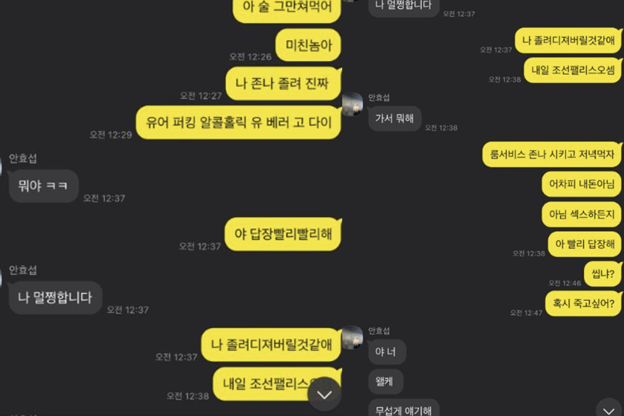 사건의 전말은 이렇습니다. 지난 달 한서희는 자신의 팬들이 모인 오픈 채팅방에 한 이미지를 공개했고, 이것이 여러 인터넷 커뮤니티에 퍼지며 대중들에게 공개된 적이 있습니다. 이 이미지는 한서희와 안효섭과의 사적인 카카오톡 대화 내용이었는데요. 지난 2023년 11월 30일 이뤄진 이 대화에서 한서희는 안효섭에게 "슈스(슈퍼스타) 됐다고 답장 안 하냐" "지금 졸리다. 빨리 답장 안 하냐. 내일 호텔 스위트룸에서 혼자 자야 되는데 와"를 비롯해 "룸서비스를 시켜서 식사를 하자고 하면서 싫으면 함께 섹스를 하자" 등 노골적인 내용이 담겨 있었고, 답장이 늦어지자 "씹냐?" "혹시 죽고싶어?"와 같은 협박성 발언도 덧붙였습니다.