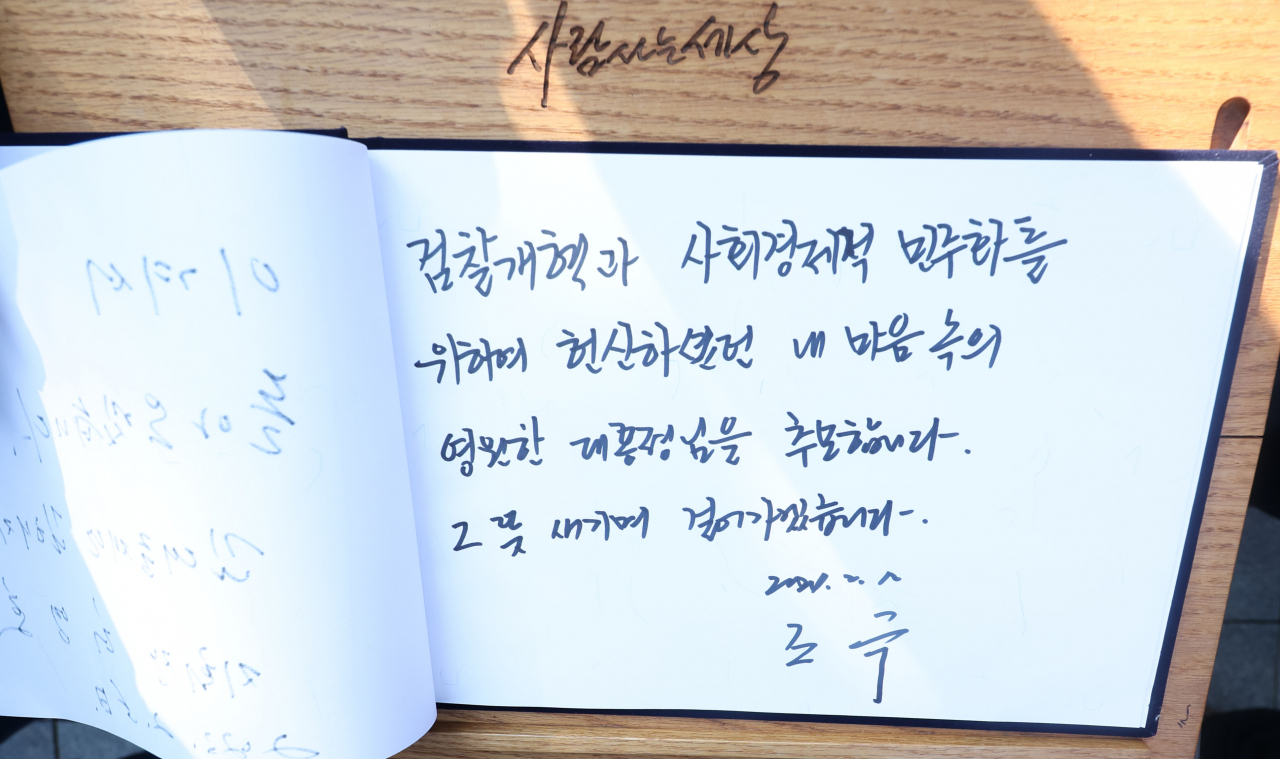 조국 전 장관은 어제(12일) 경남 김해 봉하마을을 찾아 노무현 전 대통령 묘역을 참배했습니다. 방명록에 "검찰 개혁과 사회 경제적 민주화를 위하며 헌신했던 내 마음속 영원한 대통령님을 추모합니다"라고 적은 그는 취재진과 만난 자리에서 "무도하고 무능한 윤석열 검찰 독재 조기 종식과 민주공화국의 가치를 회복하기 위한 불쏘시개가 되겠다"며 "어떠한 난관도 꺼리지 않고, 불쏘시개가 돼서 제가 하얗게 타더라도 걸어가겠다"고 밝혔습니다.