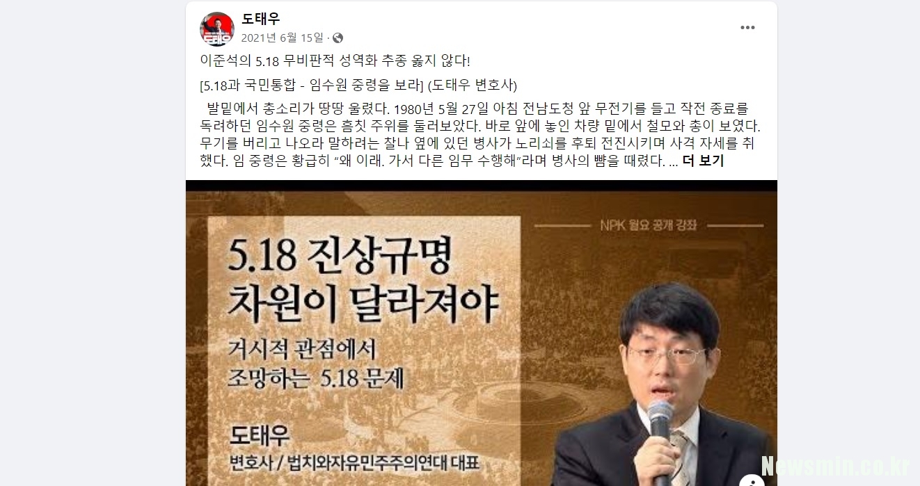 그는 "5‧18이 자유민주화적 요소가 있지만 그것으로 포섭되기 어려운 굉장히 문제적인 부분들이 있고 특히 거기에는 북한 개입 여부가 문제 된다라는 것이 사실은 상식"이라며 "그런데 이 상식을 짓밟았다. 그러자 우리 사회에 합리와 상식이 죽기 시작했다"고 말하면서 "이런 노력을 하는 움직임과 시도를 지역감정이라고 하는데, 그건 정말 오히려 마녀사냥식의 몰아붙이기"라고 항변했죠. 그리고 닷새 뒤인 2월 28일에도 같은 방송에 출연해 "5‧18을 단면적인 '학살'로 규정하는 것은 허구적인 신화에 가까우며, 진실은 균일하지 않은 복합체로 그 안에 죽음을 넘어서는 생명의 빛이 잉태되어 있음을 깨닫게 된다"고 주장한 바 있습니다.