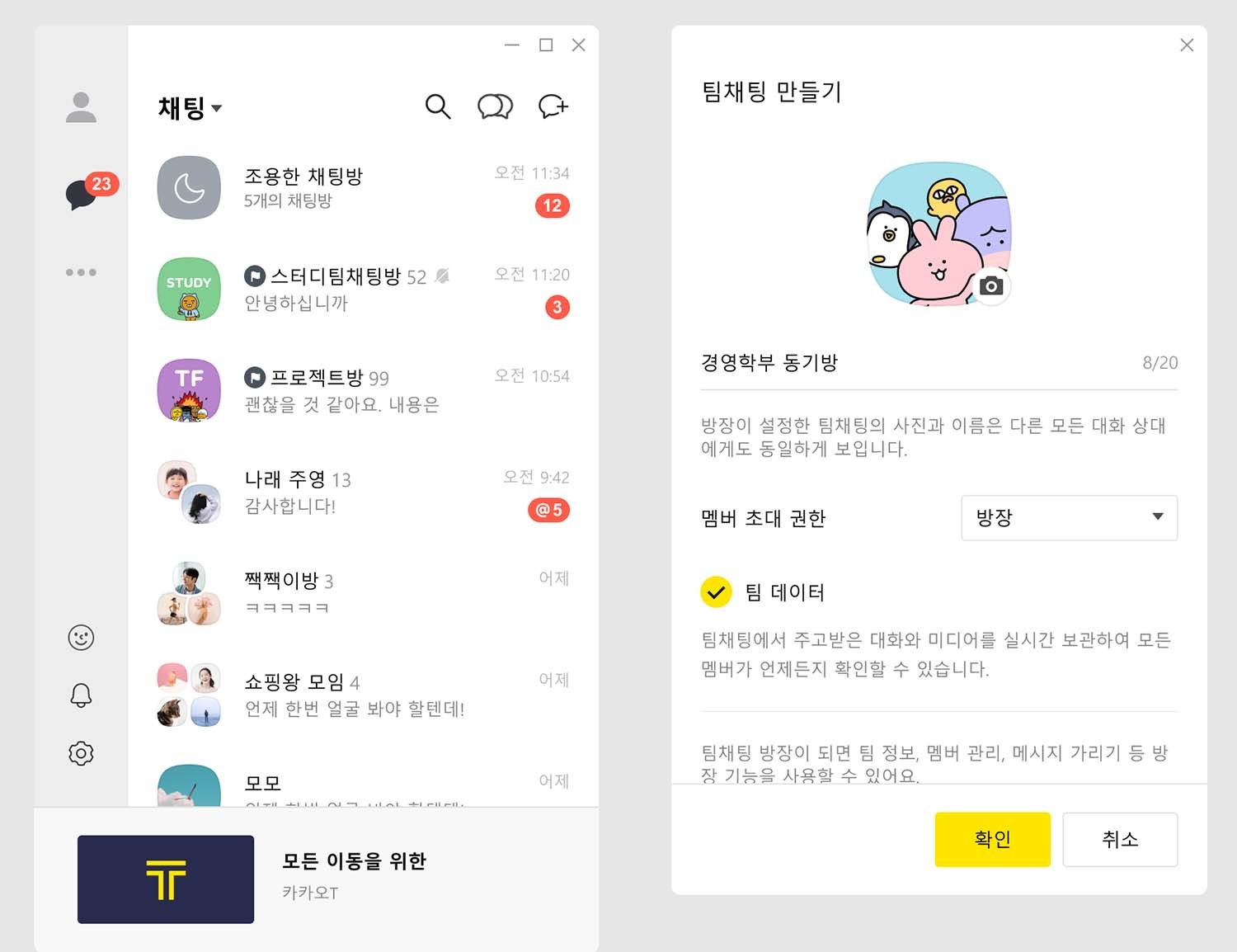 우선 첫번째로 팀채팅 기능. 팀채팅이 그룹채팅과 가장 크게 다른 점은 방장이 존재하며, 방장은 새로운 멤버를 초대하거나 기존 멤버를 내보낼 수 있는(강제 퇴장) 권한을 가진다는 점입니다. 또한 채팅방 대표 사진 및 이름 변경, 대화방 내 특정 상대의 메시지 가리기 등을 할 수 있다는 점이죠. 방장 권한은 다른 멤버에게 위임할 수도 있구요. 원래 팀채팅 기능은 구독형 상품인 '톡서랍 플러스'에서만 지원했었던 기능입니다.