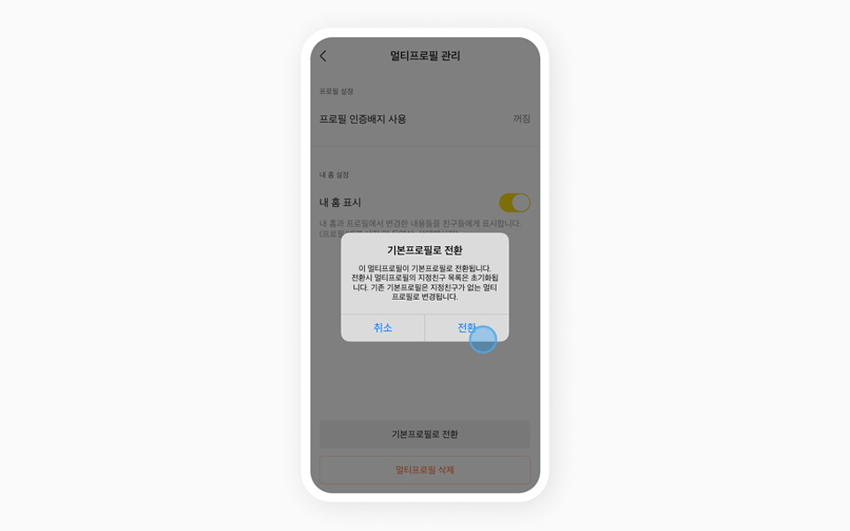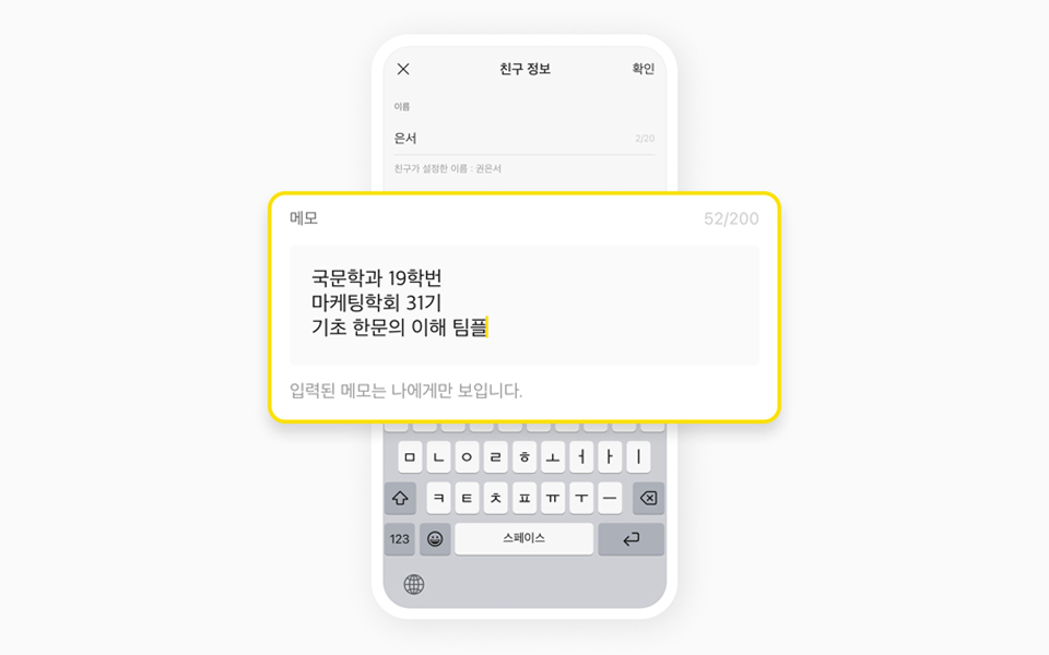 세번째로는 프로필 메모 기능입니다. 친구 이름 외에 간략한 정보를 친구의 프로필에 메모할 수 있는 기능으로, 최대 200자까지 메모가 가능합니다. 물론 이 메모는 상대방에게 보이지 않습니다. 세번째로는 멀티 프로필과 기본 프로필 전환 기능. 사용 중인 멀티 프로필 내 설정을 통해 기본 프로필로 전환이 가능합니다. 전환시 프로필에 담긴 과거 프로필 사진, 배경사진, 상태메시지 등의 히스토리도 유지되구요.