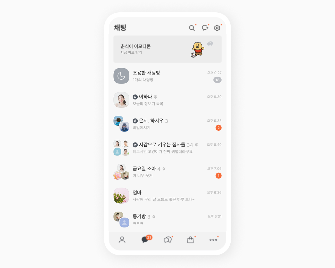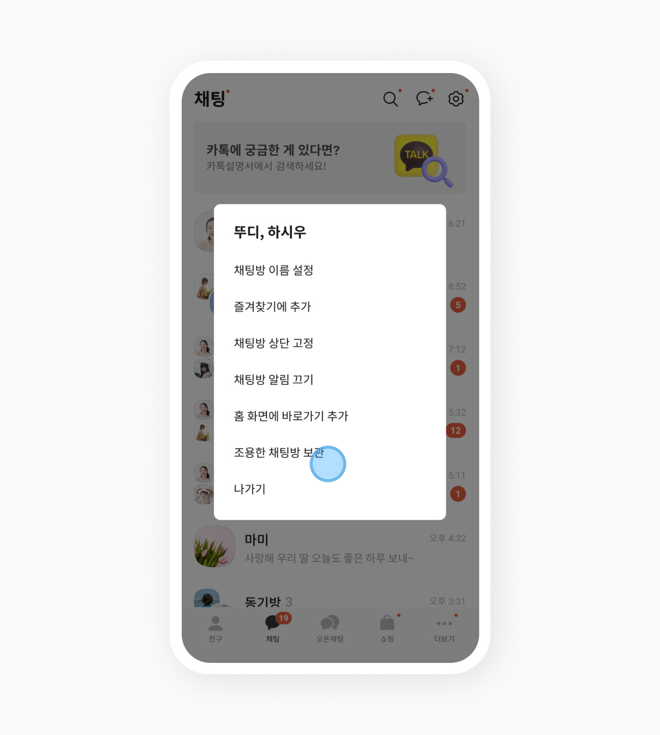 다섯번째로는 채팅방 퇴장 확인 기능. 채팅방을 나가기 전 다시 한번 확인할 수 있도록 채팅방 이름과 이미지를 보여줍니다. 간혹 실수로 채팅방을 잘못 나가는 불편함을 개선하기 위해 도입된 기능입니다. 마지막으로는 '조용한 채팅방' 기능. 단순히 알림을 무음으로 해두는 것을 뛰어넘어 자주 확인은 안하지만 나가기는 좀 어려운 채팅방을 숨겨주는 기능입니다.