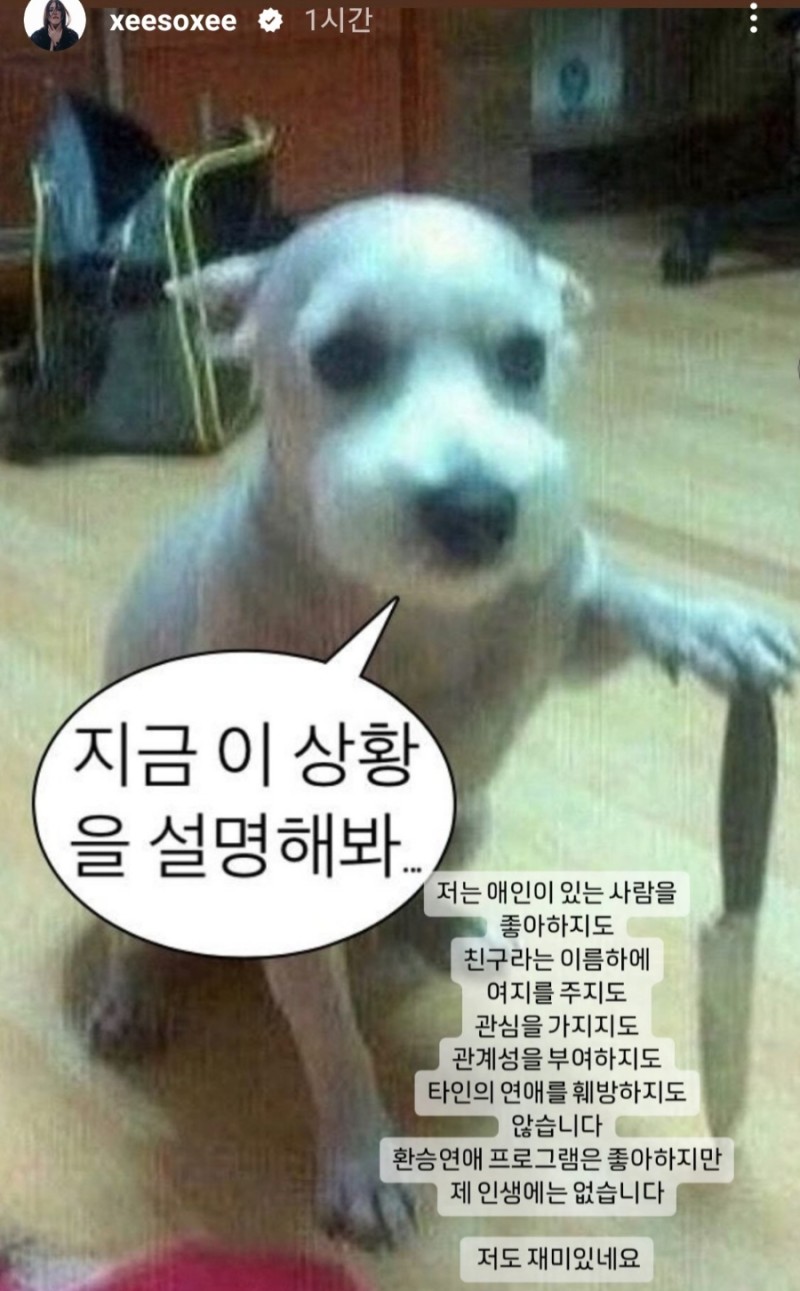 이러한 상황에서 그야말로 '본인등판'... 한소희가 자신의 인스타그램에 '지금 이 상황을 설명해봐'라는 말풍선을 단 채 칼을 들고 있는 강아지 사진을 게재했습니다. 이와 함께 한소희는 "저는 애인이 있는 사람을 좋아하지도, 친구라는 이름하에 여지를 주지도, 관심을 가지지도, 관계성을 부여하지도, 타인의 연애를 훼방하지도 않습니다. 환승연애 프로그램은 좋아하지만 제 인생에는 없습니다. 저도 재미있네요"라며 혜리를 저격했죠.
