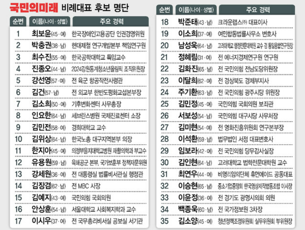 국민의미래 비례대표 후보 35명 중 당선권 인물들을 대충 살펴보면 최보윤 한국장애인고용공단 인권경영위원(변호사)을 1번으로 해서 '탈북 공학도' 박충권 현대제철 책임연구원, 최수진 한국공학대 특임교수, 진종오 대한체육회 이사, 강선영 전 육군 항공작전사령관, 김건 전 외교부 한반도평화교섭본부장, 김소희 기후변화센터 사무총장 등 7명이 모두 한동훈 위원장이 모두 한동훈 비대위원장 영입인사들입니다. 또한 인요한(64) 전 혁신위원장(8번), 부당노동행위 혐의로 유죄판결을 받았으나 약 넉달 만인 지난 2월 형 선고 실효 및 복권된 김장겸 전 문화방송 사장(14번)도 안정권에 들었죠.