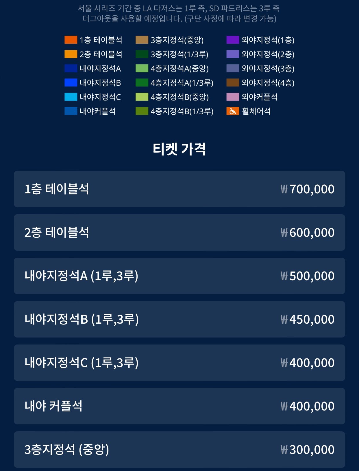 개막전 경기 티켓가격은 50,000원의 휠체어석을 제외하곤 외야 4층 120,000원부터 1층 테이블석 700,000원까지 책정이 됐는데(연습경기는 개막전 가격의 50%), 1인당 2매까지만 예매할 수 있음에도 1차전 입장권이 예매 오픈 15분 만에 1만 6,000석 전석 매진됐다고 하죠. 암표는 최고 200만원을 호가했다고 하구요. 이번 행사는 KBO가 아닌 MLB 주최 행사라 KBO는 물론 구단 직원들도 표를 구하기 어려웠고, 심지어 1차전 선발 투수였던 다르빗슈 유조차 지인들의 표 요청을 들어주지 못해 곤혹가을 감추지 못했다고 합니다. "경기장인 고척돔의 규모가 작아 표를 구하기 어렵다"고 불평을 했다고 하죠.