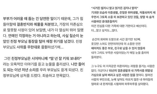 "순간의 회피와 도망으로 시간 끌기만 1년째. 옷깃만 스쳐도 인연이라던데 이 소중한 인연 헤어져도 좋은 부모, 친구로 남을 수 있지 않을까 내가 그리도 부족한 사람이었는가 매일 눈물 흘리며 돌아본다"면서 "그 누구도 이 지옥같은 이혼이라는 과정을 즐기는 사람은 없다. 더군다나 15년의 결혼생활과 내 가족사를 휘발성 가십으로 날려 버리고 싶은 사람은 없을 것이다. 알려진 사람의 부인으로, 눈에 넣어도 아프지 않은 내 아이들의 엄마로 내 한계치를 시험하며 하루하루를 살아왔다"고 토로했습니다.