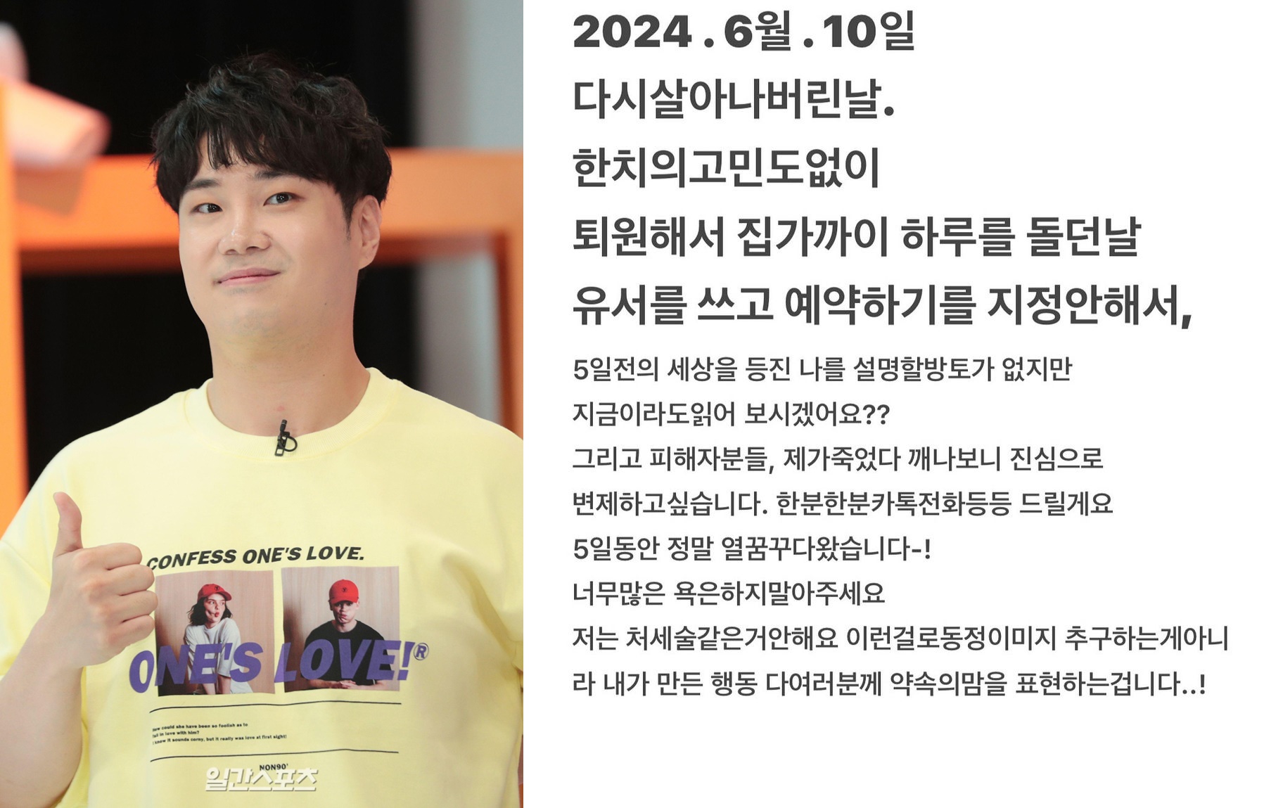 작곡비 사기, 성희롱 의혹 등 각종 논란에 휘말렸던 작곡가 겸 방송인 유재환이 자신이 작성했다가 올리지 않았다던 유서를 공개했습니다. 유재환은 10일 오후 자신의 인스타그램에 '2024년 6월 10일 다시 살아나버린 날'로 시작하는 글을 올렸습니다. "유서를 쓰고 예약하기 지정을 안 해서 5일 전의 세상을 등진 나를 설명할 방도가 없지만 지금이라도 읽어 보시겠냐"며 그는 5일 전 극단적 선택을 시도하기 전 작성한 것으로 추정되는 자신의 유서를 공개했죠.