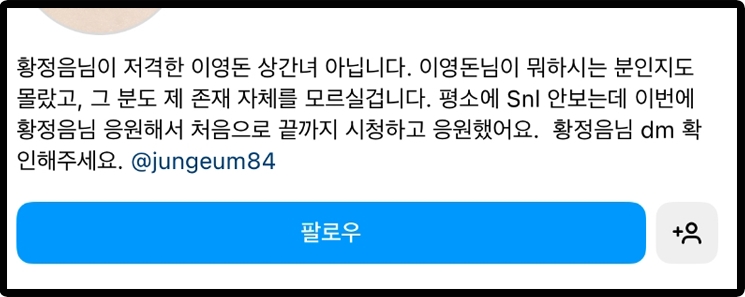 하지만 여기서 이영돈의 상간녀로 지목된 A씨가 직접 인스타그램 계정에 입장을 밝혀 억울함을 호소했습니다. "황정음 님이 저격한 이영돈 상간녀 아닙니다. 이영돈 님이 뭐 하시는 분인지도 몰랐고, 그분도 제 존재 자체를 모르실 겁니다"고 적은 A씨는 "평소에 SNL 안 보는데 이번에 황정음 님 응원해서 처음으로 끝까지 시청하고 응원했다. 황정음 님 DM 확인해달라"고도 적었죠.