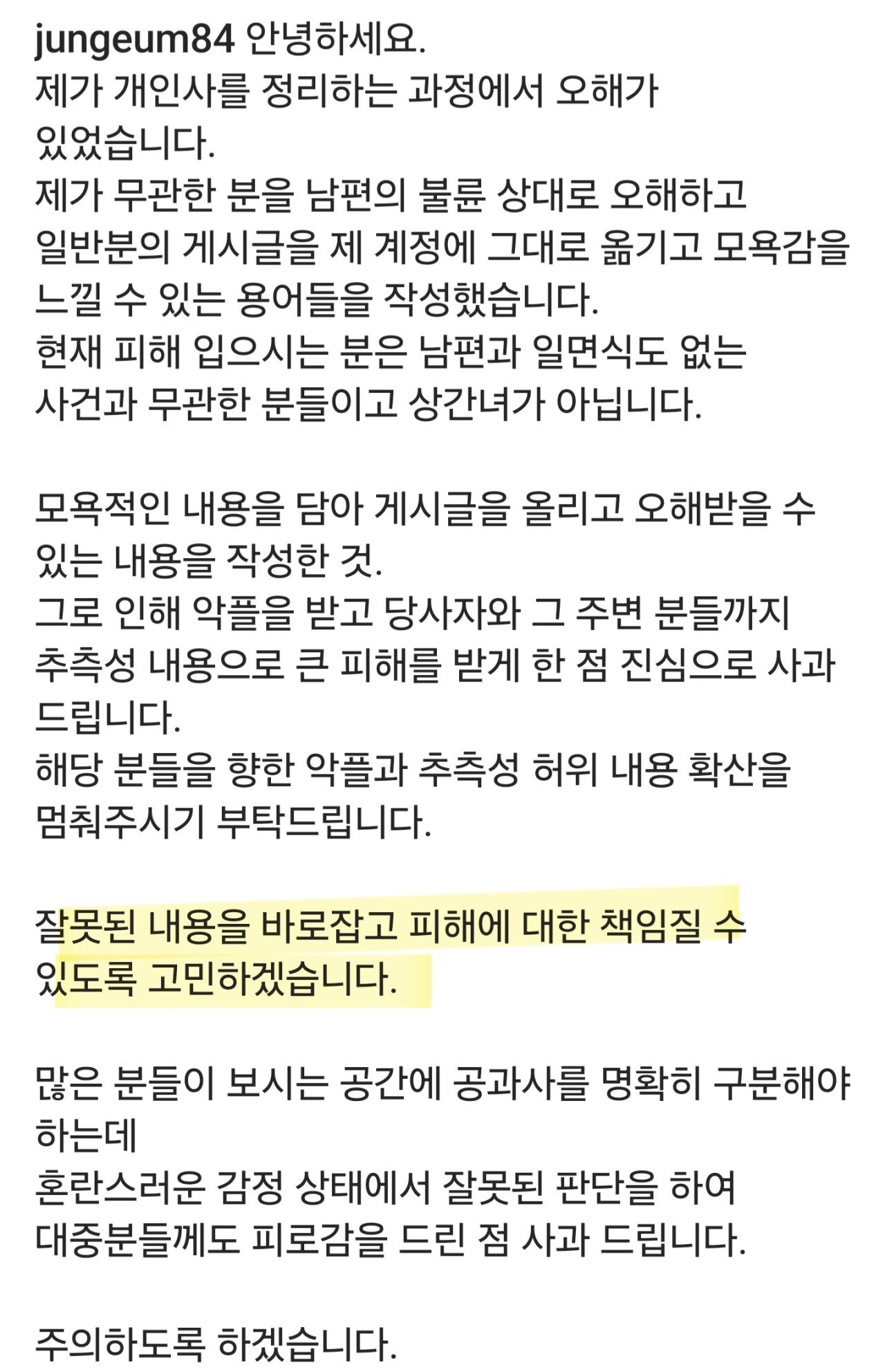 논란이 이어지자 황정음은 두 번째로 사과문을 올립니다. 황정음은 "제가 무관한 분을 남편의 불륜 상대로 오해하고 일반분의 게시글을 제 계정에 그대로 옮기고 모욕감을 느낄 수 있는 용어들을 작성했다. 현재 피해 입으시는 분은 남편과 일면식도 없는 사건과 무관한 분들이고 상간녀가 아니다"라면서 "모욕적인 내용을 담아 게시글을 올리고 오해받을 수 있는 내용을 작성한 것, 그로 인해 악플을 받고 당사자와 그 주변 분들까지 추측성 내용으로 큰 피해를 받게 한 점 진심으로 사과드린다. 해당 분들을 향한 악플과 추측성 허위 내용 확산을 멈춰주시기 부탁드린다. 잘못된 내용을 바로잡고 피해에 대한 책임질 수 있도록 고민하겠다"고 덧붙였습니다.