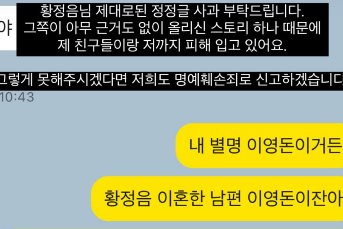 게다가 A의 친구 역시 "이영돈은 '이OO'이라는 내 이름 때문에 생긴 별명이다. 황정음 남편 이영돈을 지칭하는 게 아니다"라면서 "제대로 된 정정글과 사과 부탁드린다. 근거 없는 스토리에 제 친구들과 저까지 피해를 입고 있다. 그렇게 못하겠다면 명예훼손죄로 신고하겠다"고 경고합니다.
