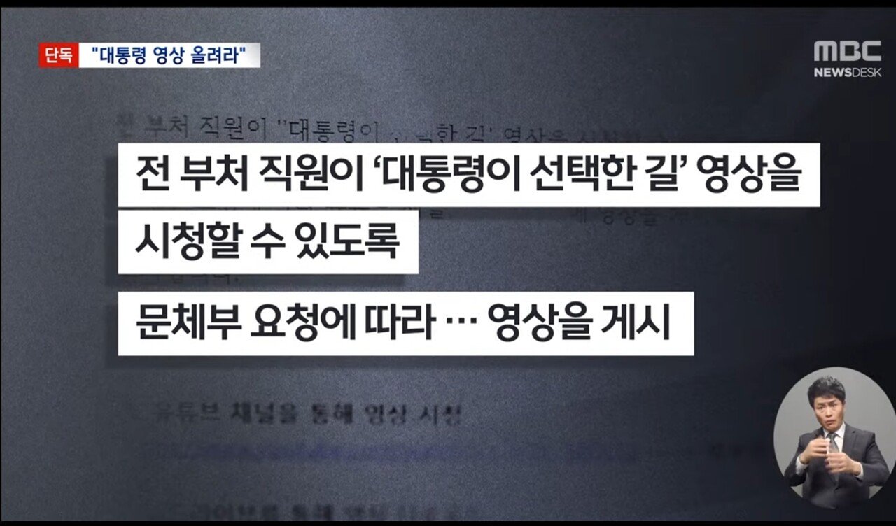 자, 이번에는 문화체육관광부로 와보죠. 제22대 국회의원 선거 사전투표를 하루 앞둔 4일, 문화체육관광부가 정부 부처에 '공무원들이 대통령 정책홍보 영상을 볼 수 있게 게시물을 올려달라'고 요청한 사실이 드러났습니다. 이날 윤석열 대통령 공식 유튜브 채널에 '대통령이 선택한 길'이라는 3분 15초 분량의 영상이 올라왔습니다. '한일관계 정상화'와 '건전재정 기조 구축', 'R&D 예산 혁신' 등이 윤 대통령의 치적이라며 홍보하는 내용이었는데요.