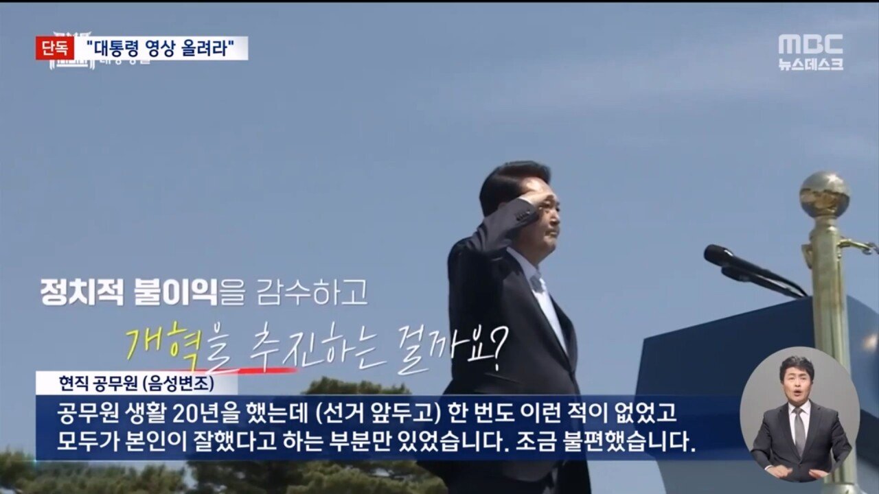 이에 공무원들 내부에선 '사실상의 선거 운동'이라는 비판의 목소리가 터져 나왔습니다. 한 공무원은 "공무원 생활 20년을 했는데 (선거 앞두고) 한 번도 이런 적이 없었고 모두가 본인이 잘했다고 하는 부분만 있었다. 조금 불편했다"고 밝히기도 했죠. 결국 이렇게 반발이 커지자 일부 부처에선 해당 영상을 게시판에서 삭제되었습니다. 정부 부처의 한 관계자는 "대통령의 우수한 정책에 대해 홍보가 필요하다며 문체부가 요청해 왔다"고 언급했죠.