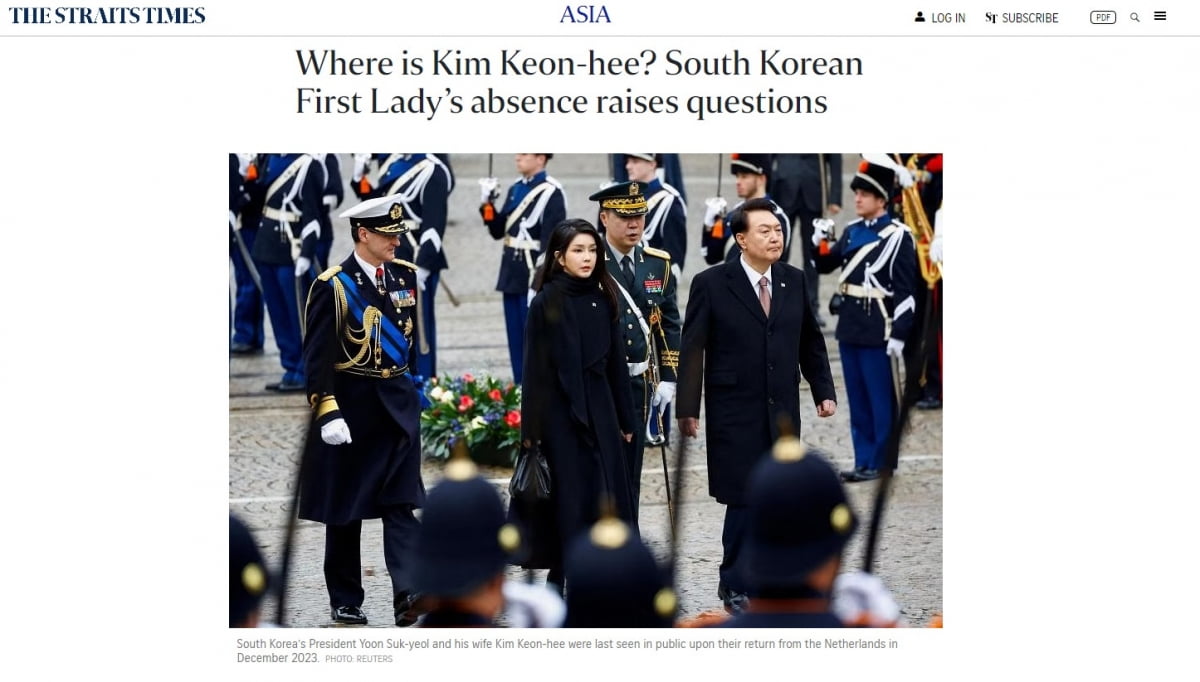 김건희 여사의 현재 상태에 대해서는 외신들까지 주목을 하고 있는 상황입니다. 로이터통신은 지난 2일(현지시간) "한국 영부인이 큰 선거를 앞두고 세간의 주목을 피하고 있다(South Korea's first lady avoids limelight ahead of high-stakes election)"는 제목의 기사를 보도했고, 싱가포르 매체인 더 스트레이츠 타임스 역시 지난달 20일 "김 여사는 어디에? 한국 영부인의 부재가 낳는 의문들(Where is Kim Keon-hee? South Korean Frirst Lady's absence raises questions)"이라는 제목의 기사를 보도했죠. 진짜 부끄러기 그지없습니다.